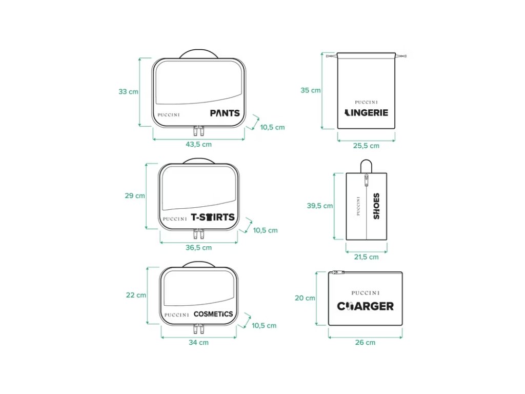 Každý organizér je pečlivě navržený a označený, což výrazně usnadňuje třídění oblečení, bot, kosmetiky či doplňků. Díky nim bude váš kufr vždy perfektně uspořádaný a hledání oblíbeného trička nebo nabíječky přestane být problémem.