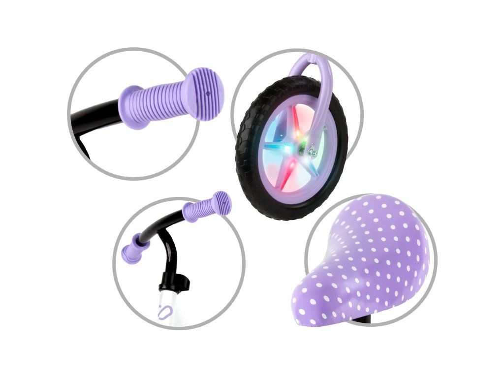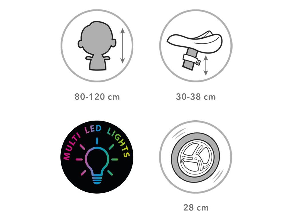 Velká kola o průměru 28 cm z kvalitní EVA pěny zajišťují plynulou, tichou a stabilní jízdu bez nutnosti dofukování. Jsou odolná proti propíchnutí a dobře tlumí nerovnosti. Integrovaná LED světla se aktivují během jízdy bez potřeby baterií, což zvyšuje nejen atraktivitu, ale i viditelnost dítěte.
