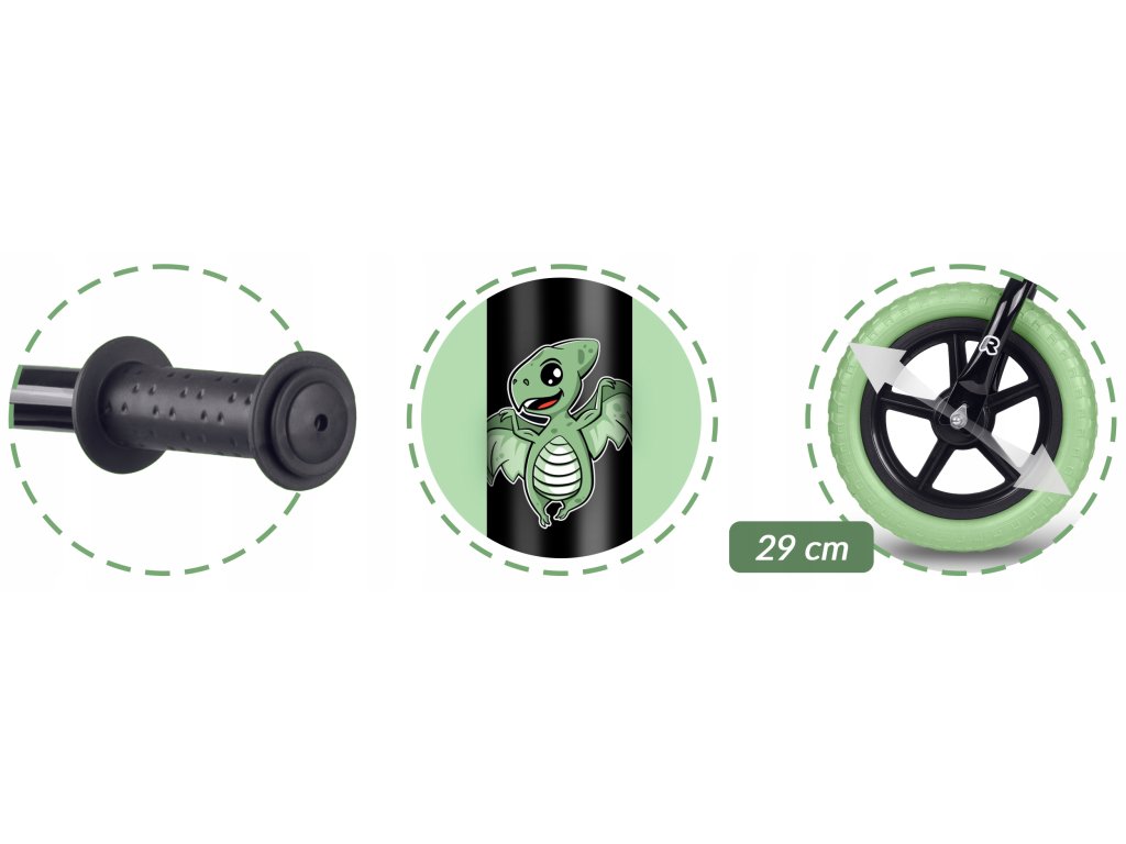 - Bezdušová kola EVA (29 cm) – lehká, tichá a odolná proti vlhkosti, UV záření i nízkým teplotám.