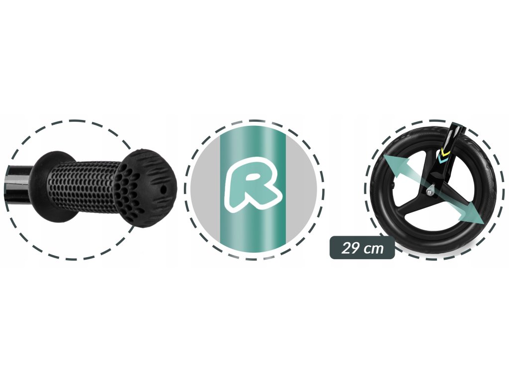 - Bezdušová kola EVA (29 cm) – lehká, tichá a odolná proti vlhkosti, UV záření i nízkým teplotám.