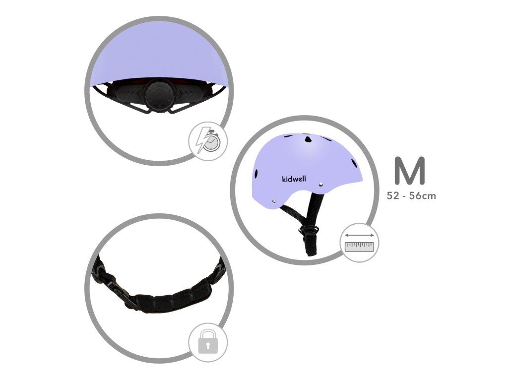 Helma je vybavena praktickým systémem regulace pomocí otočného kolečka, který umožňuje snadné přizpůsobení obvodu hlavy v rozmezí 52–56 cm. Díky tomu helma dobře sedí a roste spolu s dítětem.