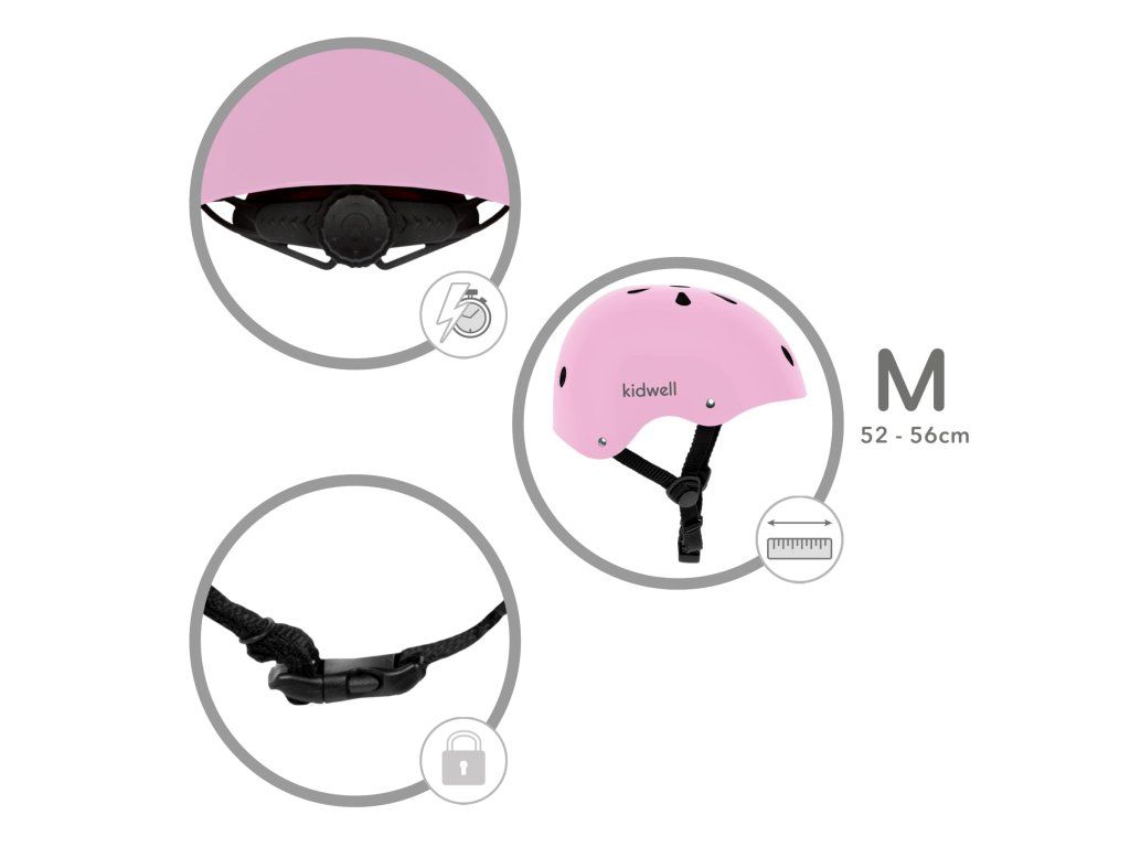 Helma je vybavena praktickým systémem regulace pomocí otočného kolečka, který umožňuje snadné přizpůsobení obvodu hlavy v rozmezí 52–56 cm. Díky tomu helma dobře sedí a roste spolu s dítětem.