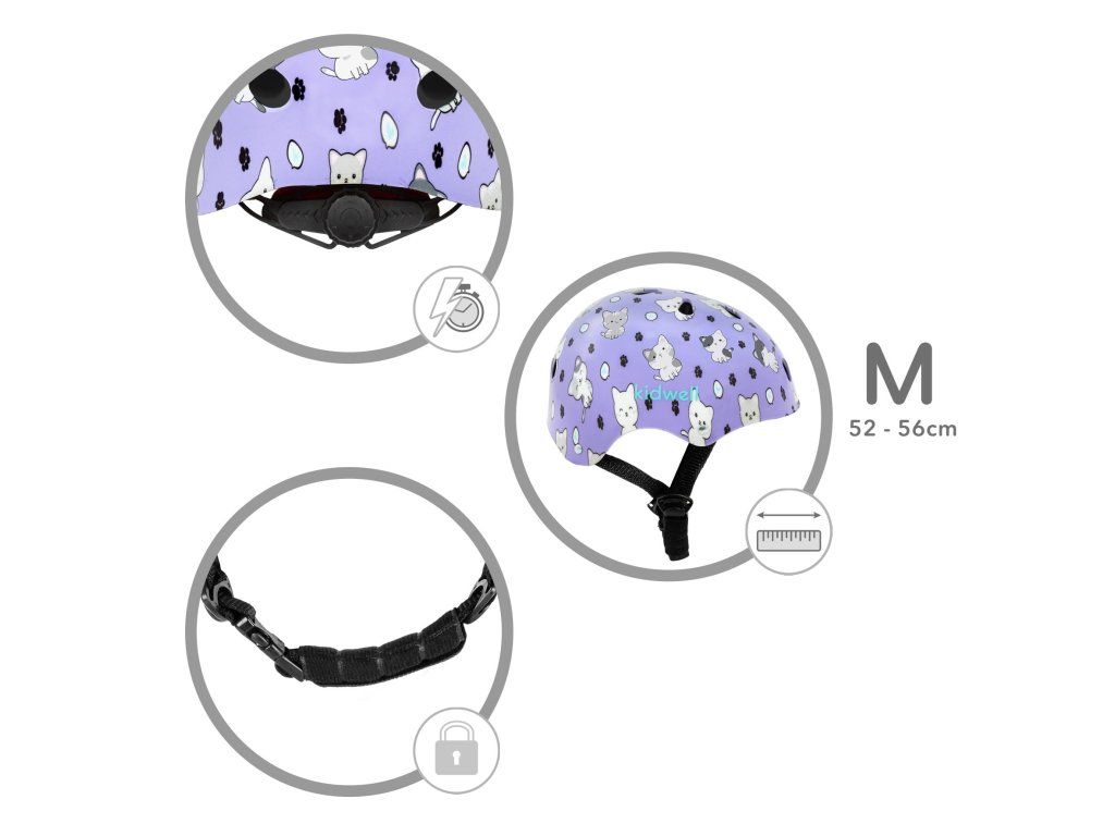 Helma je vybavena praktickým systémem regulace pomocí otočného kolečka, který umožňuje snadné přizpůsobení obvodu hlavy v rozmezí 52–56 cm. Díky tomu helma dobře sedí a roste spolu s dítětem.