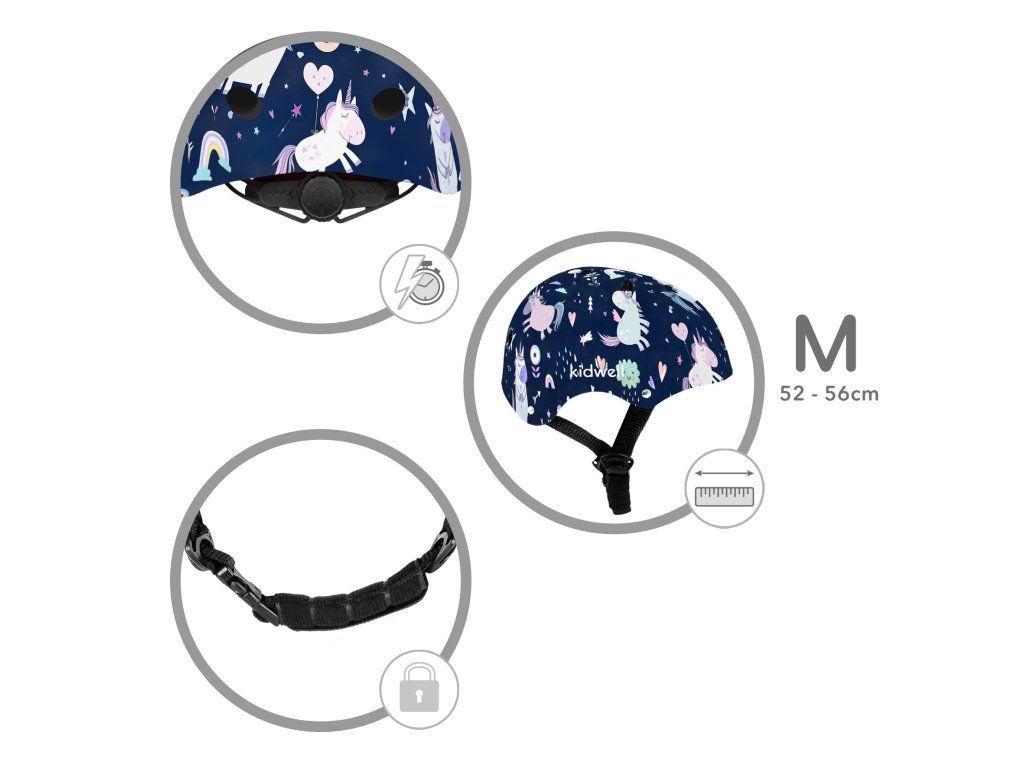 Helma je vybavena praktickým systémem regulace pomocí otočného kolečka, který umožňuje snadné přizpůsobení obvodu hlavy v rozmezí 52–56 cm. Díky tomu helma dobře sedí a roste spolu s dítětem.