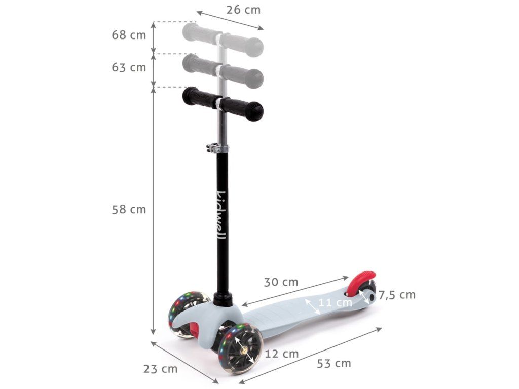 - Materiál: hliníková řídítka, plastová deska, polyuretanová kola s LED