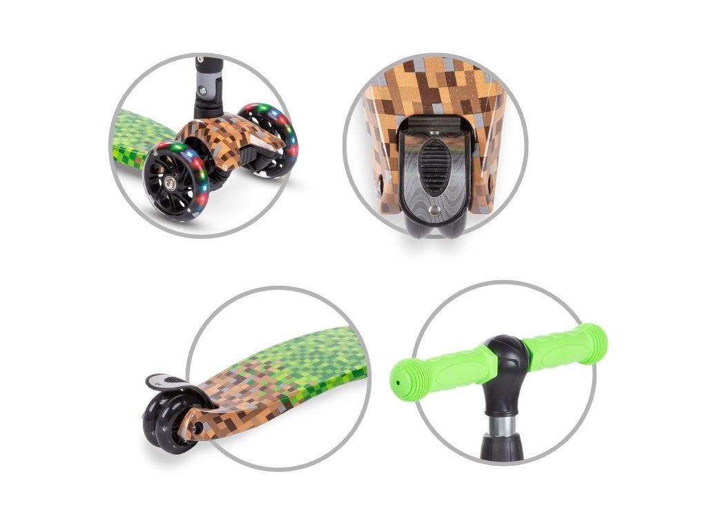 Kvalitní polyuretanová kola zajišťují tichou, plynulou jízdu a výbornou přilnavost k povrchu. Integrované LED diody se aktivují během jízdy bez potřeby baterií a zvyšují nejen atraktivitu, ale i viditelnost dítěte.