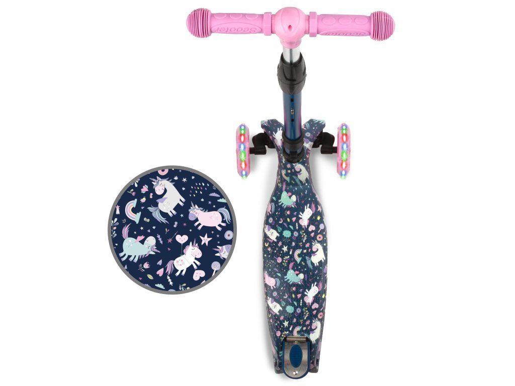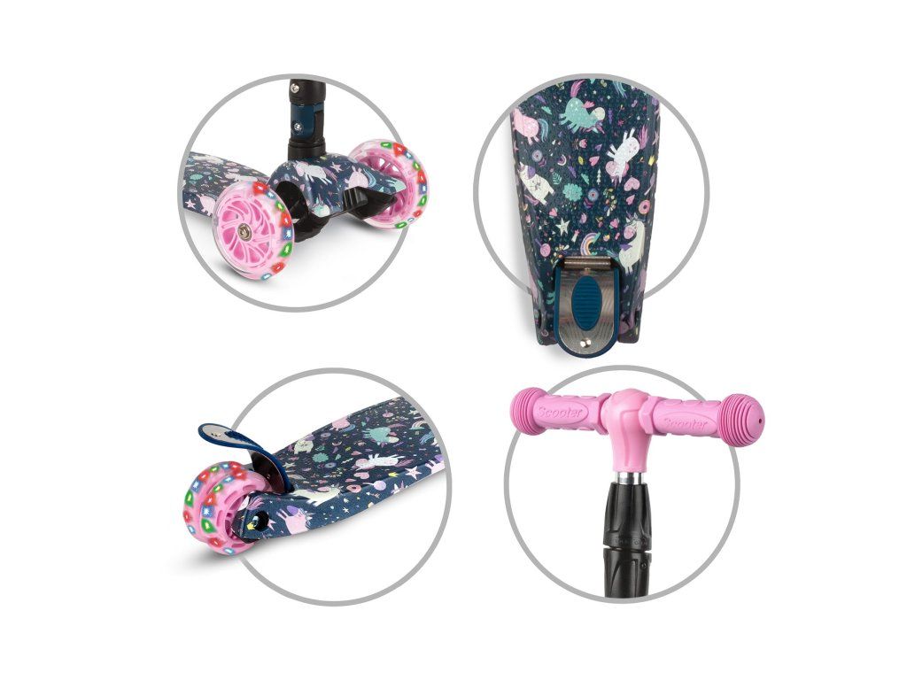 Kvalitní polyuretanová kola zajišťují tichou, plynulou jízdu a výbornou přilnavost k povrchu. Integrované LED diody se aktivují během jízdy bez potřeby baterií a zvyšují nejen atraktivitu, ale i viditelnost dítěte.