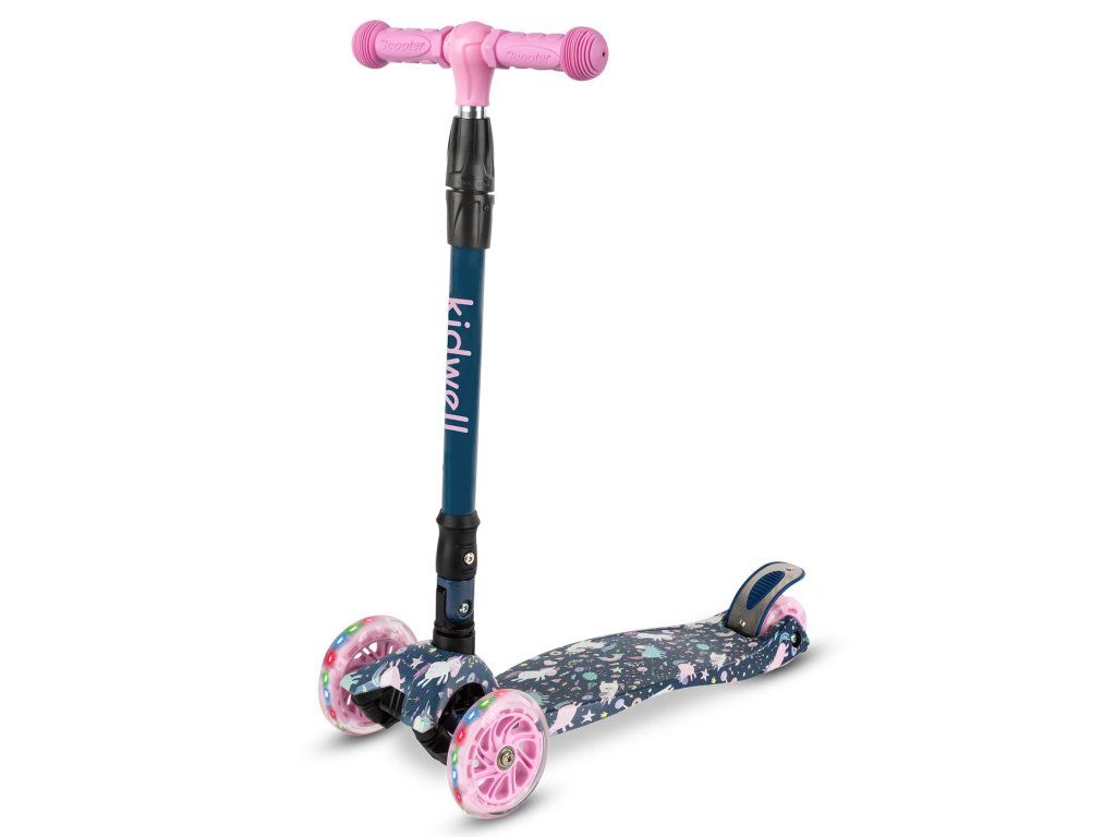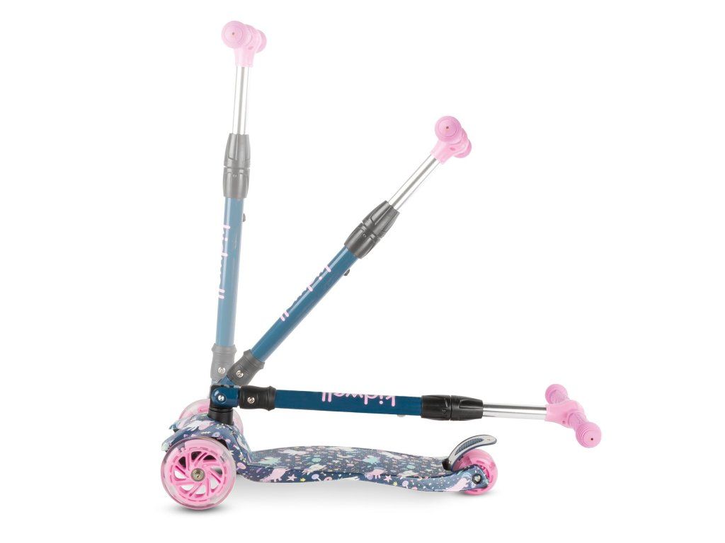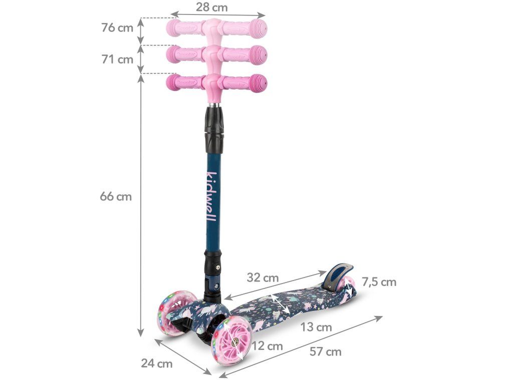 Koloběžka váží pouhých 2,7 kg, což zajišťuje snadnou manipulaci a pohodlné používání. Široký rozchod předních kol pomáhá udržet stabilitu a usnadňuje dětem první jízdy.