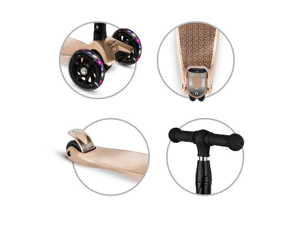 Kvalitní polyuretanová kola zajišťují tichou, plynulou jízdu a výbornou přilnavost k povrchu. Integrované LED diody se aktivují během jízdy bez potřeby baterií a zvyšují nejen atraktivitu, ale i viditelnost dítěte.