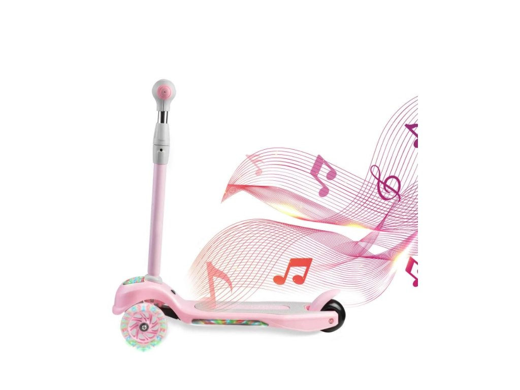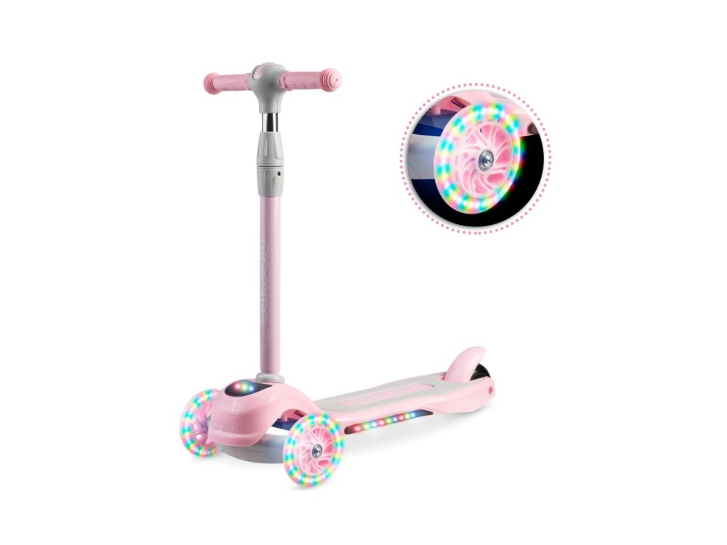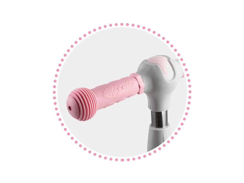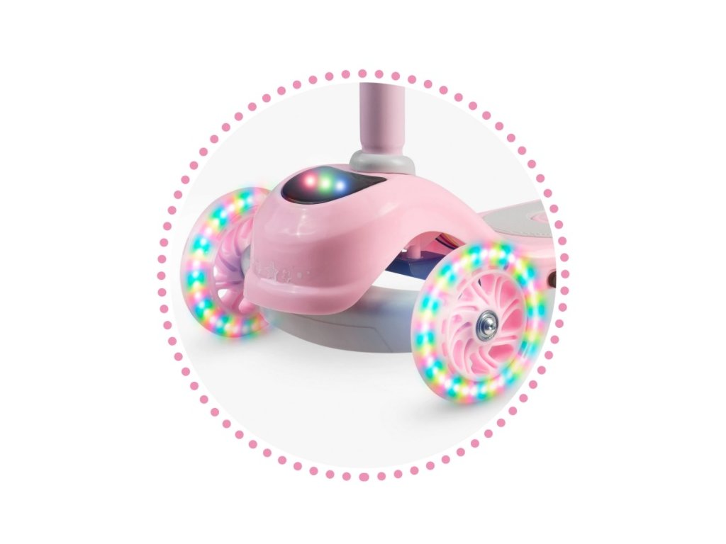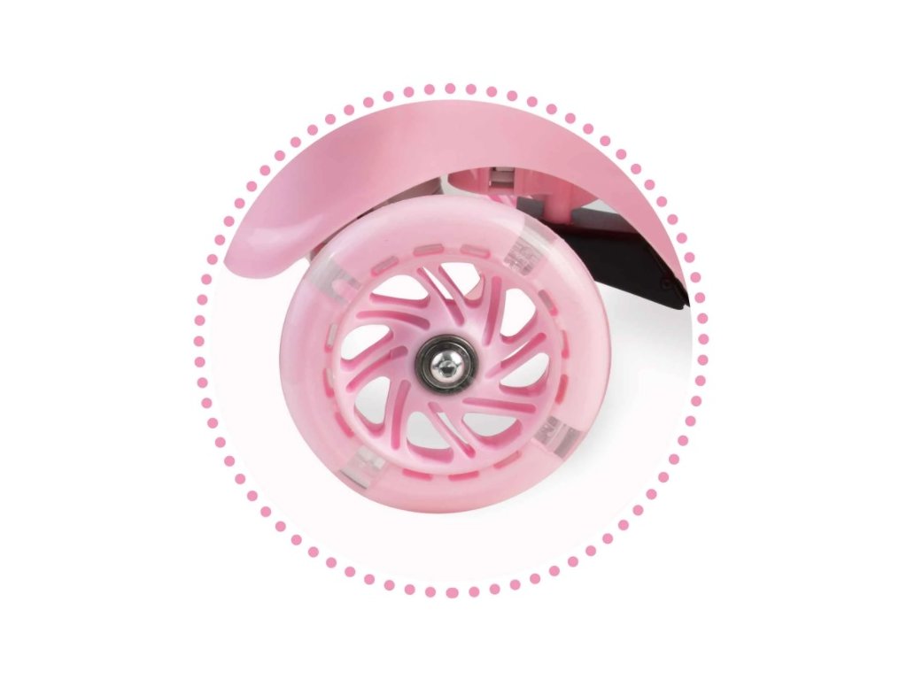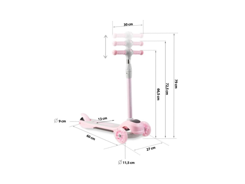 Koloběžka je opatřena několika bezpečnostními a ochrannými prvky. Prostorná nášlapná deska s neklouzavou úpravou, protiskluzové rukojeti řídítek. Má LED blikající kola a nastavitelnou výšku řídítek.
