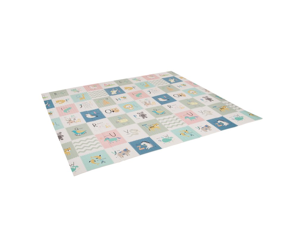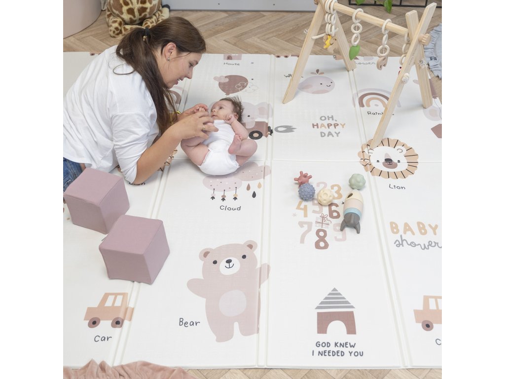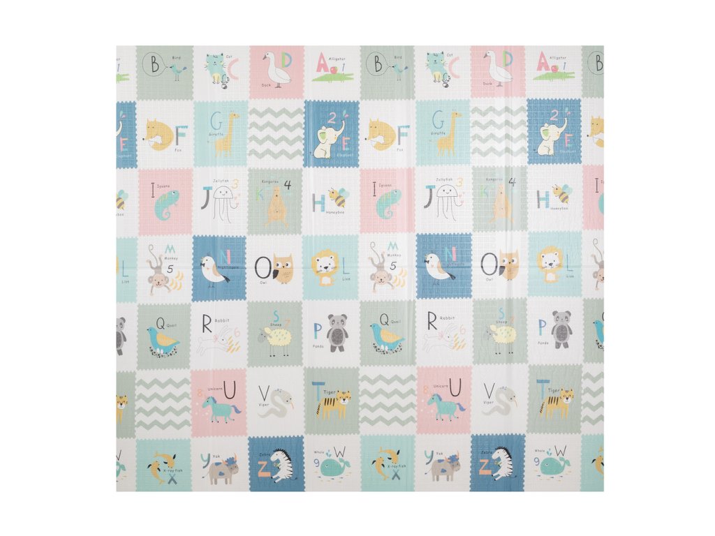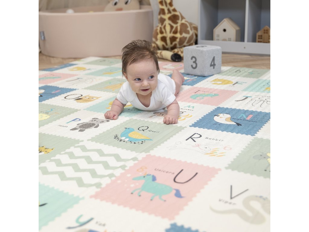 - Bezpečí a pohodlí – podložka má protiskluzovou strukturu, tloušťku 1 cm a vynikající tlumicí vlastnosti. Chrání dítě při pádu a izoluje od studené a tvrdé podlahy.