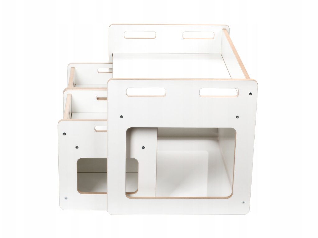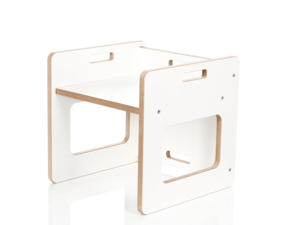 Stolek lze jednoduše přeměnit na praktickou truhlu na hračky nebo výtvarné potřeby. Díky tomu šetří místo a získává další využití v každodenním provozu.