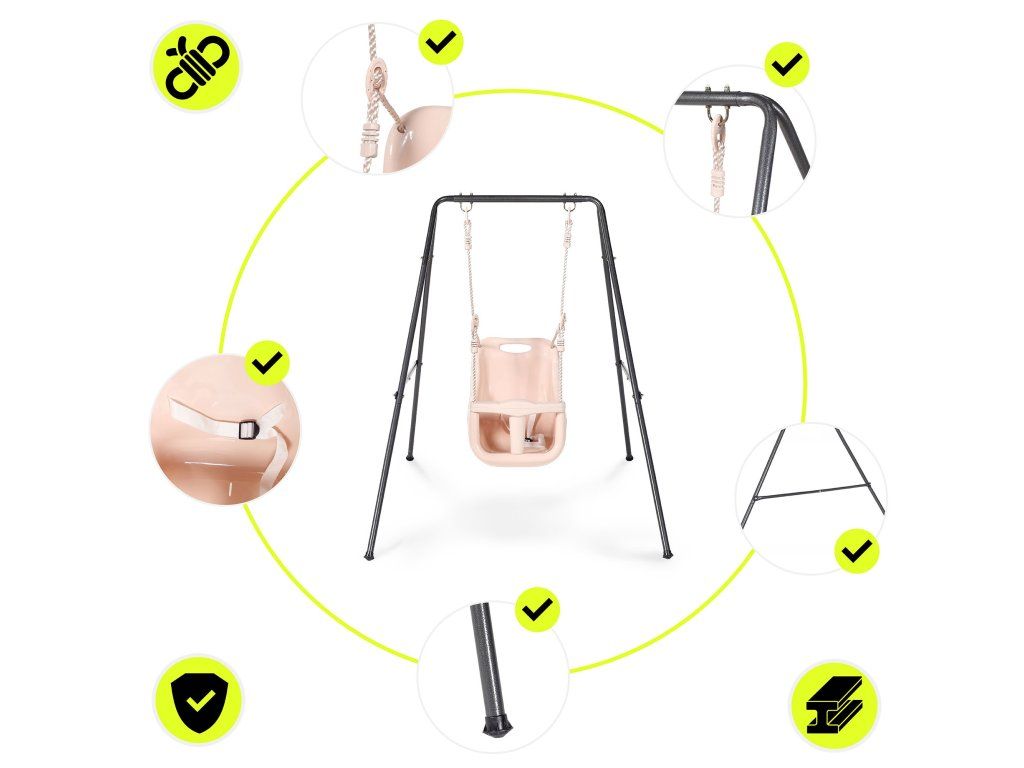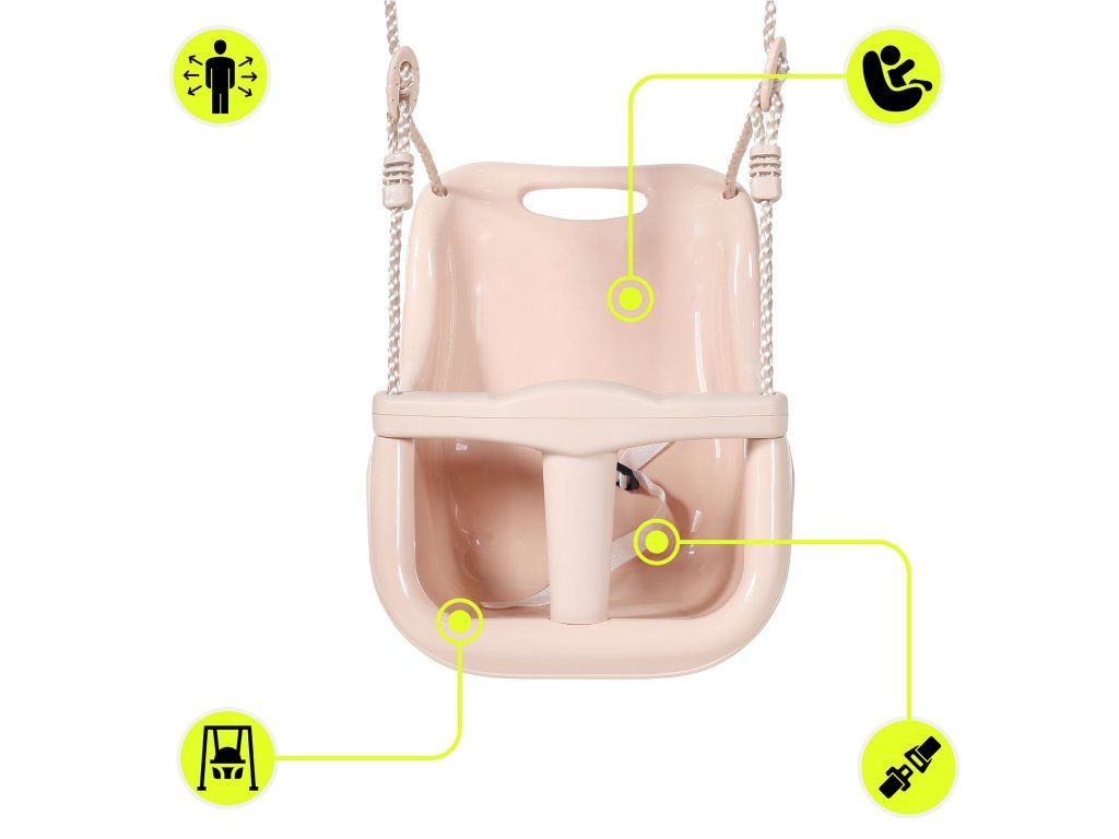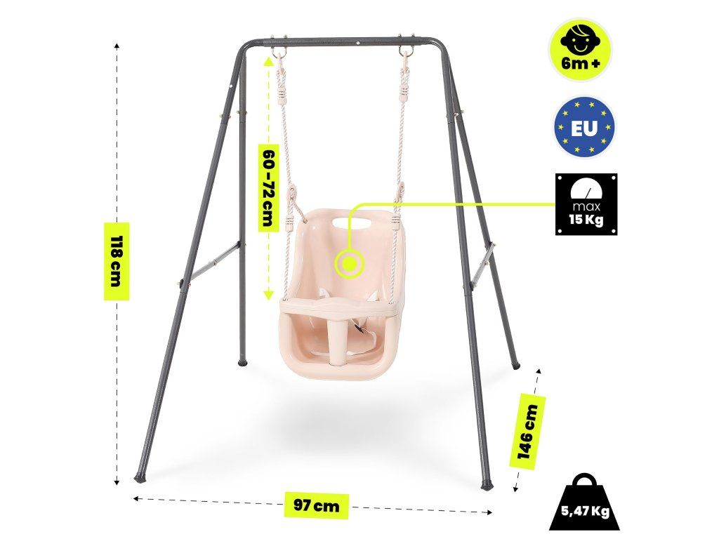 Dětská houpačka je ideálním řešením pro nejmenší děti od 6 měsíců, které již dokážou samostatně sedět. Nabízí bezpečné, stabilní a pohodlné prostředí pro každodenní hru a jemné houpání, které podporuje přirozený rozvoj motoriky, koordinace a rovnováhy. Díky modernímu designu v tlumených barvách se skvěle hodí do interiéru i na zahradu.