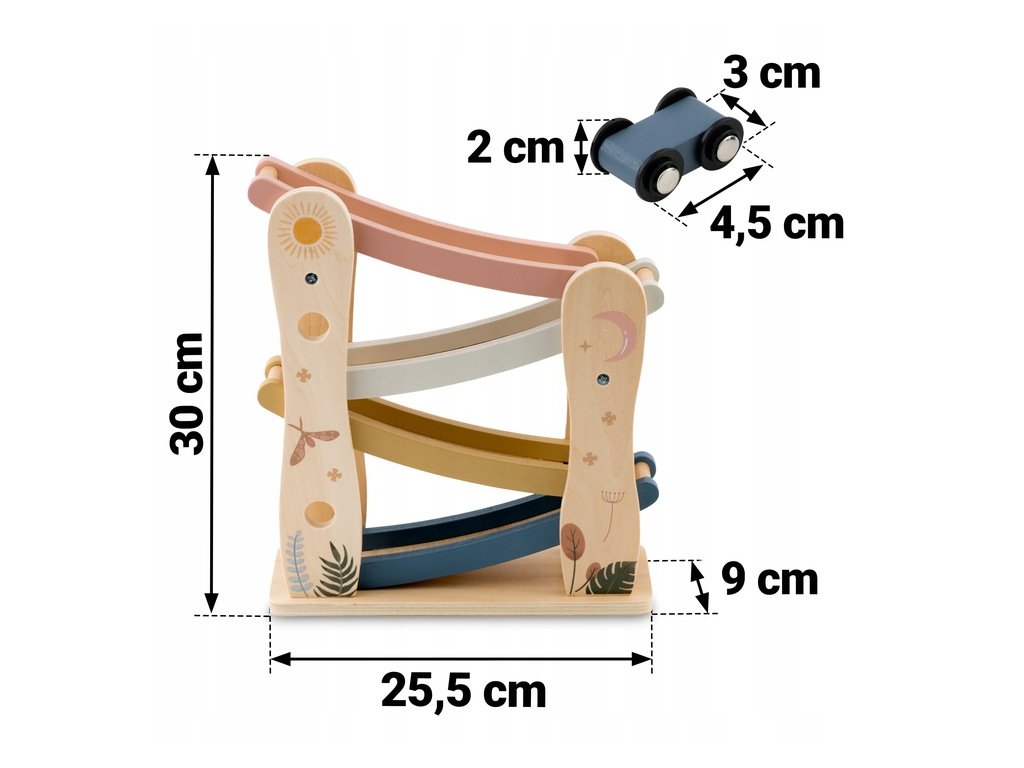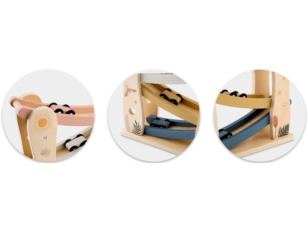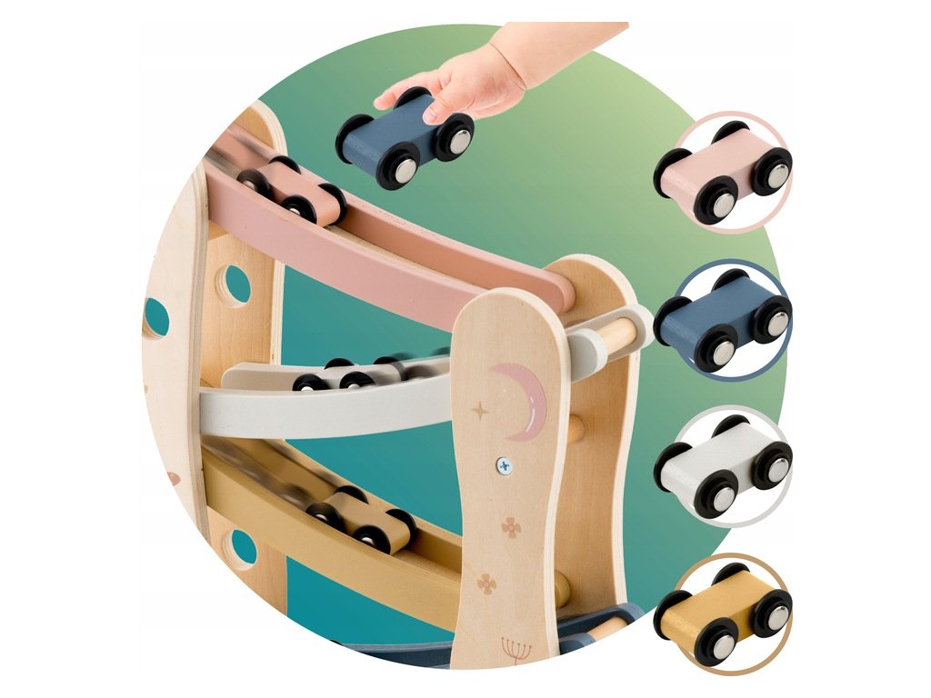Dřevěná skluzavka s autíčky je klasická, ale zároveň mimořádně atraktivní hračka, která děti seznamuje se světem pohybu, gravitace a logického myšlení. Každé z barevných autíček se rozjede po dráze a sjíždí z jednoho patra na druhé – pohled, který vždy vykouzlí úsměv a nadšení!