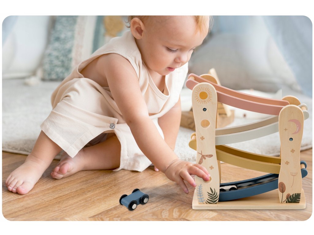 Dřevěná skluzavka stimuluje zrak, sluch i hmat – dítě sleduje pohyb autíček, poslouchá zvuky kolíček a dotýká se hladkého dřeva.