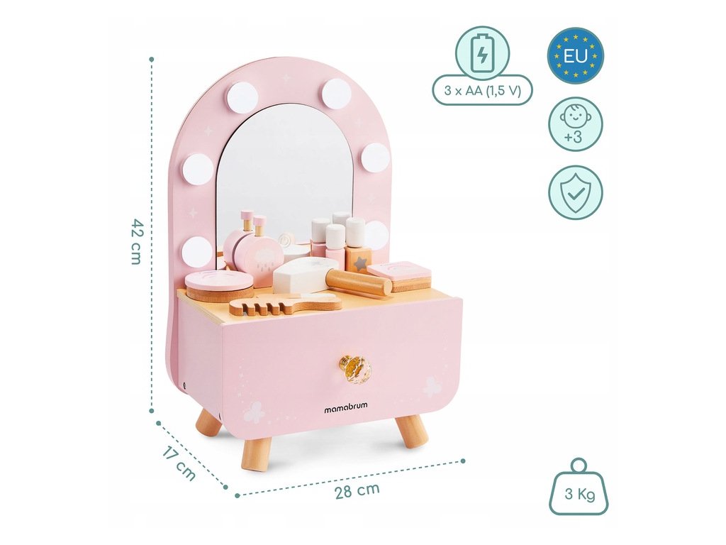 Tato roztomilá dřevěná mini toaletka s LED osvětlením přináší dětem svět fantazie, krásy a tvůrčí hry v kompaktním, přenosném provedení. Je ideální pro malé slečny, které milují napodobování dospělých a chtějí si vytvořit svůj vlastní kouzelný koutek krásy – a to doslova kdekoliv.