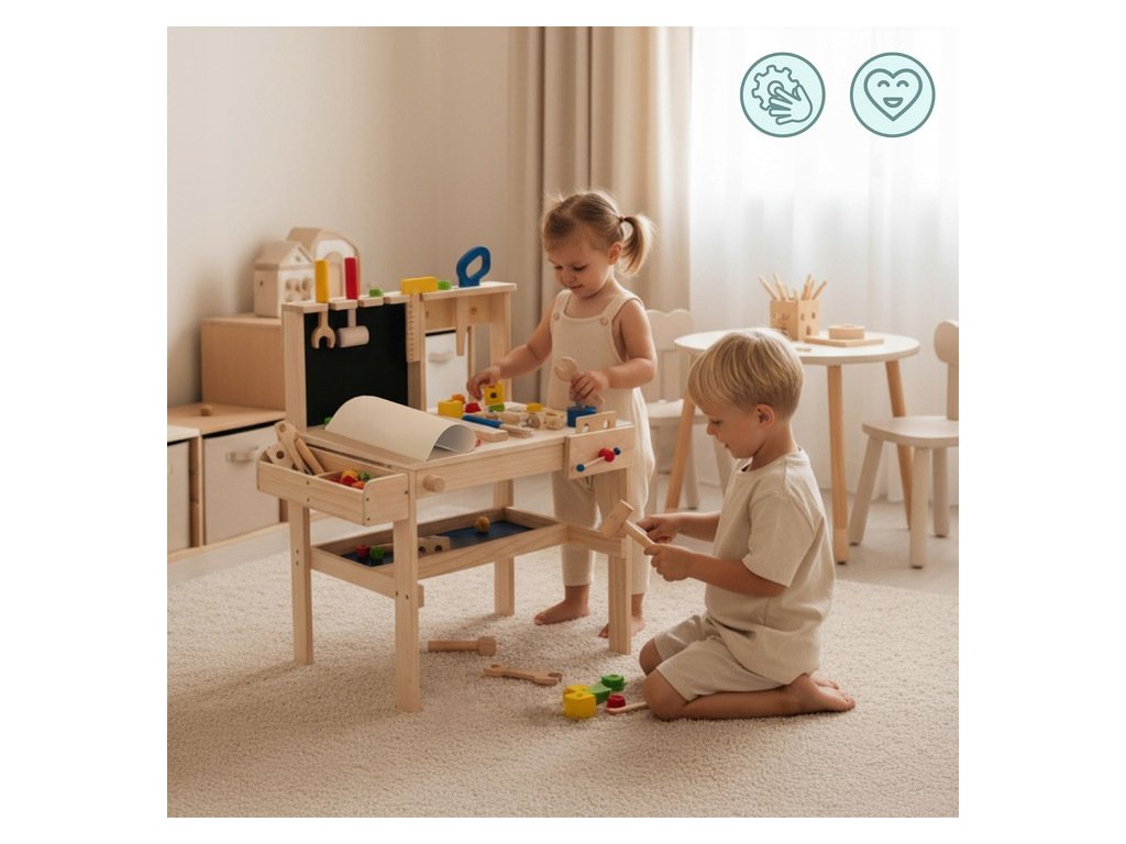 Dílna je vyrobena z pevného dřeva a MDF desky, což zaručuje stabilitu a dlouhou životnost.