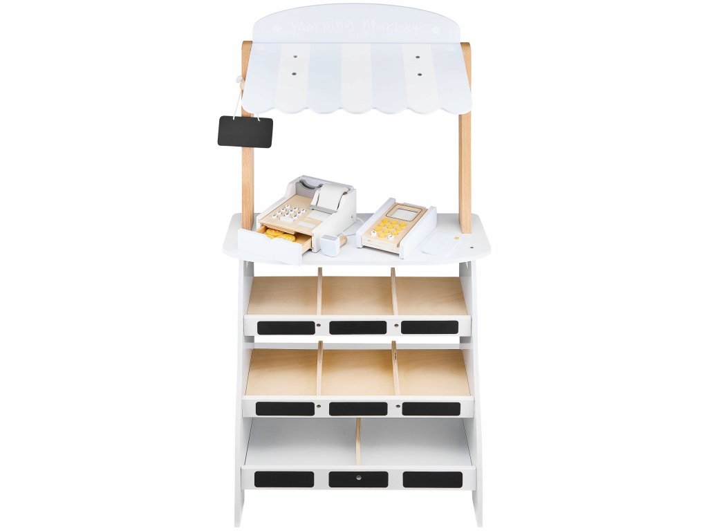 Tento krásný dřevěný stánek s pokladnou a platebním terminálem přenese děti do světa nakupování, zdravé výživy a prvních lekcí podnikavosti. Je to výjimečná edukační hračka, která rozvíjí představivost, učí počítat a podporuje učení hrou.