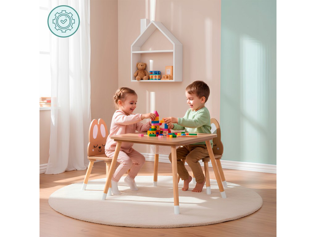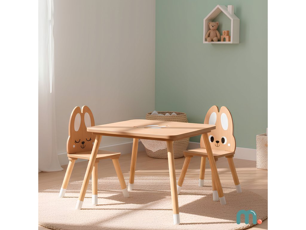 Dřevěný stoleček s úložným prostorem a židličkami Roztomilý Králíček není jen nábytek, ale i kouzelné místo, které rozvíjí dětskou kreativitu, samostatnost a radost z objevování každý den.