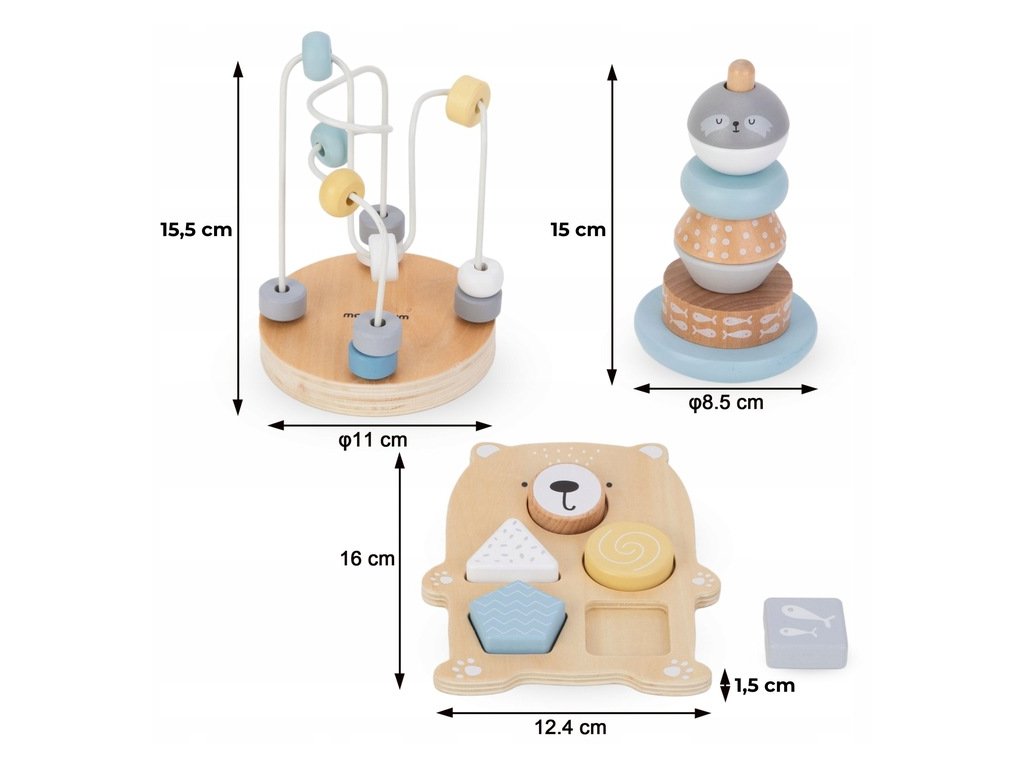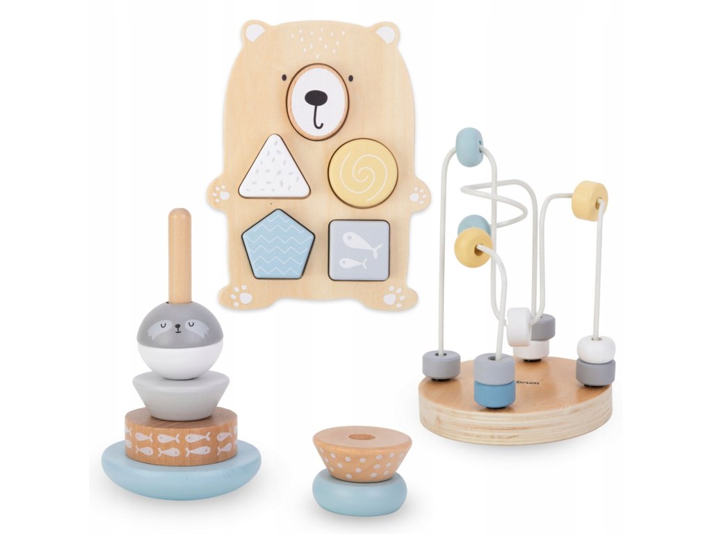 Sada dřevěných hraček – labyrint, pyramida Tuleni a třídič Medvídek je perfektní volbou pro všechny malé objevitele. Spojuje učení a hru, podporuje přirozený rozvoj dítěte a přináší hodiny radosti a úsměvů.