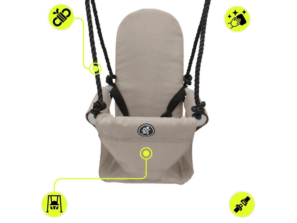 Měkké sedátko s vysokým opěradlem poskytuje dítěti stabilní a pohodlnou polohu. Integrovaný bezpečnostní pás zvyšuje ochranu během houpání. Sedák z odolné oxfordské tkaniny je příjemný na dotek a snadno se čistí.