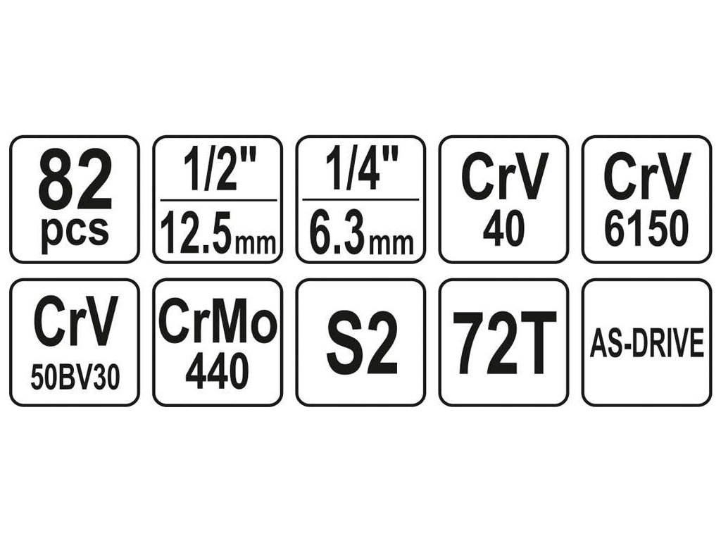 Profesionální sada nářadí, zhotovená pro potřeby specializovaných autoservisů a mechanických služeb. Nástroje jsou precizně vyrobeny z materiálů, které zajišťují jejich spolehlivost. Nádstavce vybavené systémem AS-Drive, zvyšujícím maximální točivý moment o 25 %, s plnou ochranou hran matic, nádstavce s dvoubarevnou povrchovou úpravou. Ořechy byly vyrobeny metodou zápustkového kování a před procesem kalení byla kalibrována pomocí přesných měřidel a kontrolních zařízení. Sada umožňuje práce vyžadující velmi vysoké zatížení a přesnost, umožňuje provádět mnoho servisních činností spojených s povolováním a utahováním závitových spojů různých jmenovitých velikostí. Sada nářadí se skládá ze 82 prvků umístěných v praktickém plastovém kufříku, díky kterému lze sadu použít pro menší montážní práce, mechanické opravy a mnoho dalších prací v domácnosti nebo dílně.