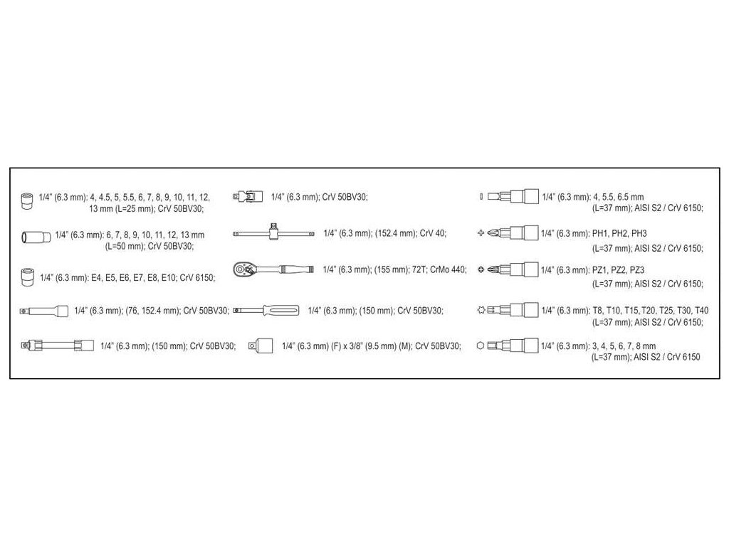 - 12x nástavec 1/4": 4; 4.5; 5; 5.5; 6; 7; 8; 9; 10; 11; 12, 13 mm (L= 25 mm)