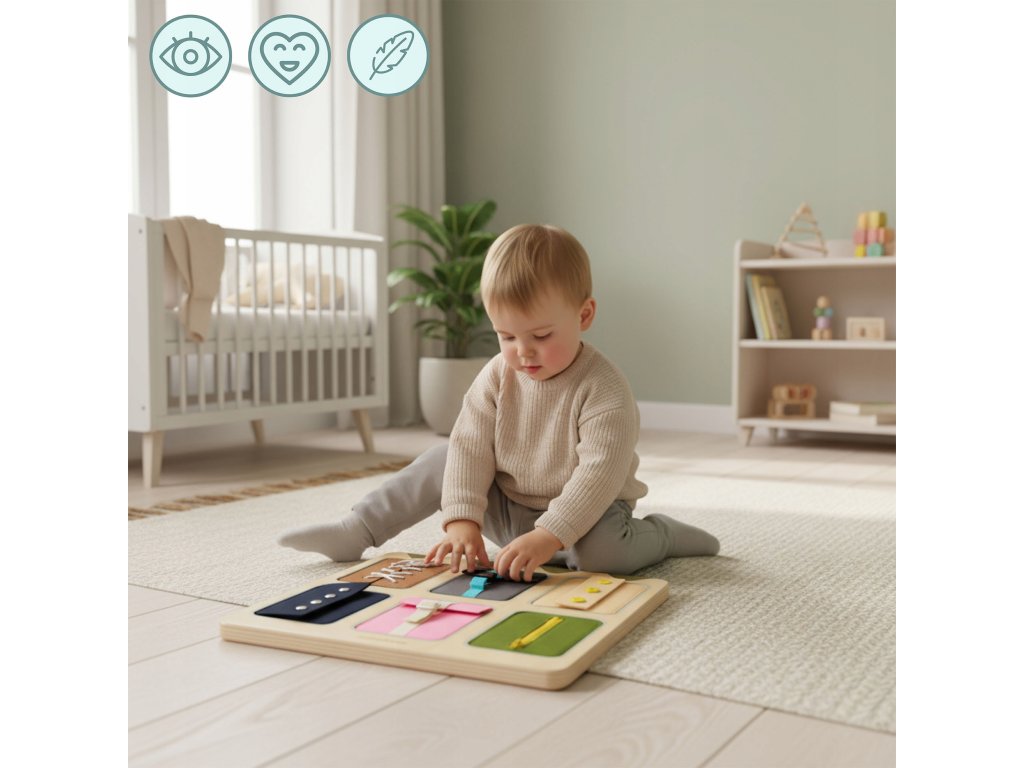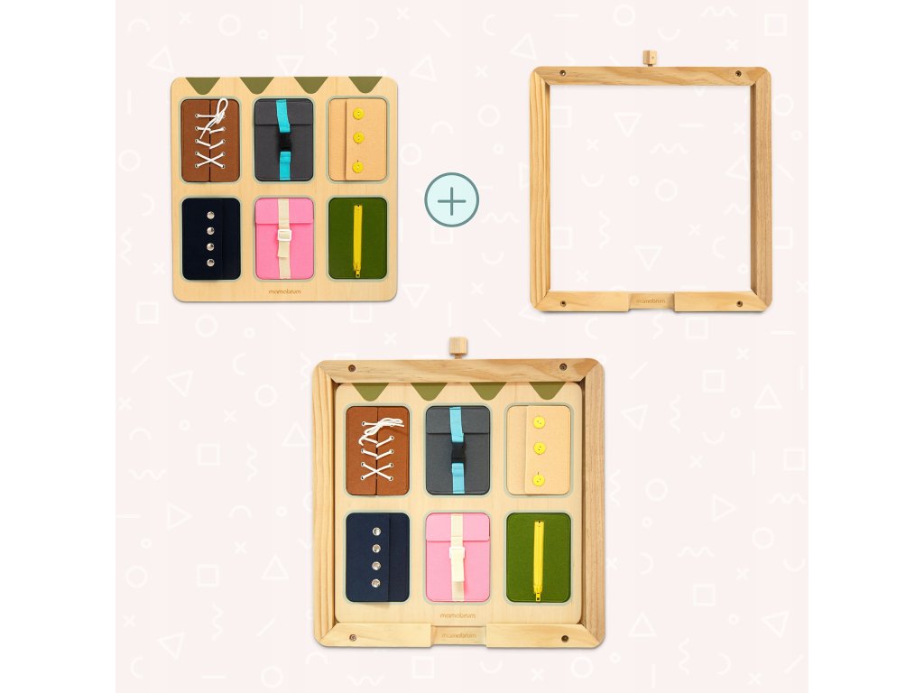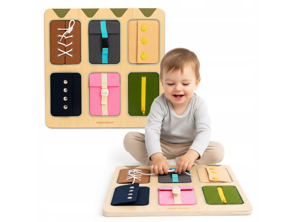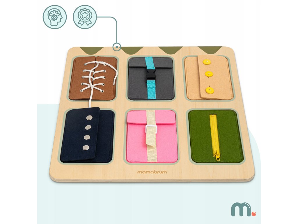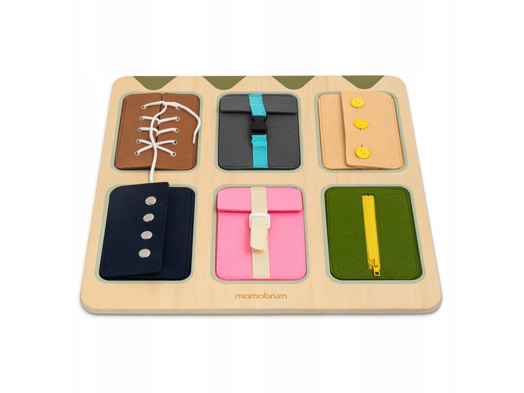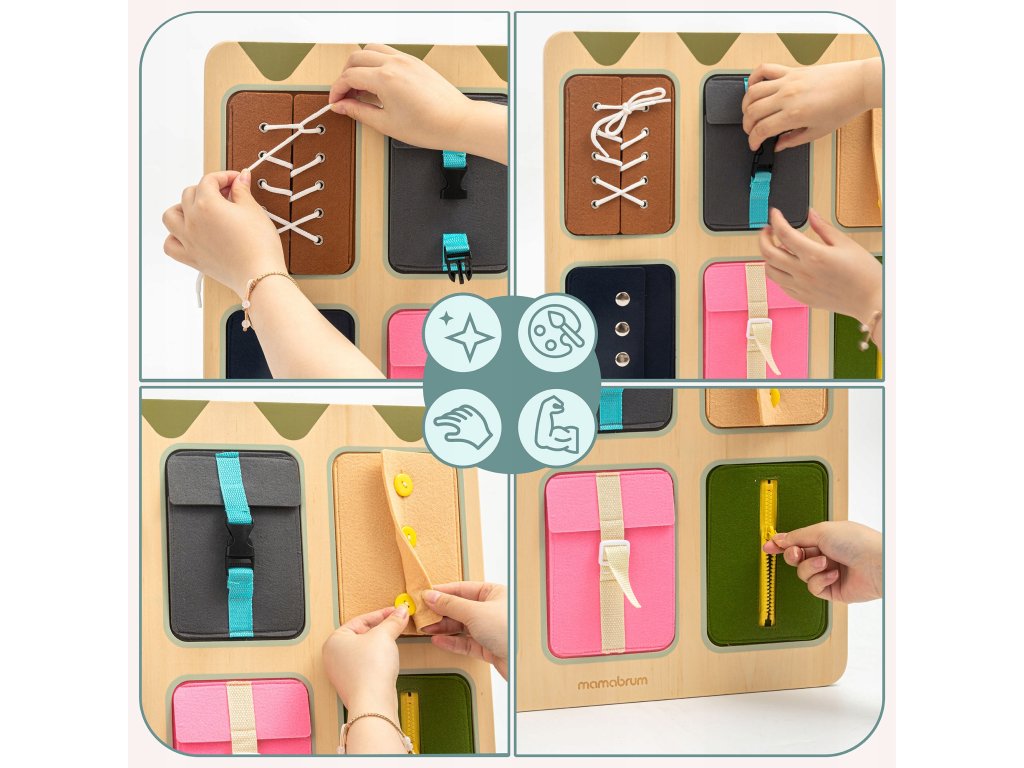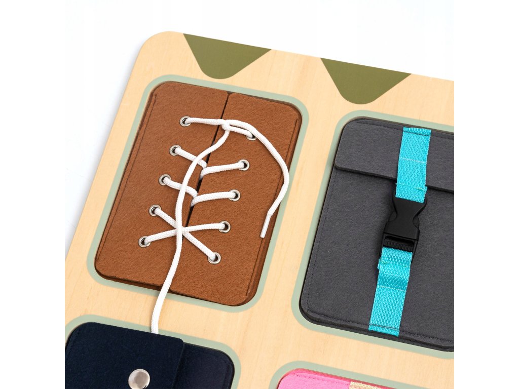 Díky různorodým mechanismům může dítě zkoušet to, co vídá každý den – zapnout zip na bundě, přezku na batohu, knoflík na svetru nebo uvázat tkaničku.