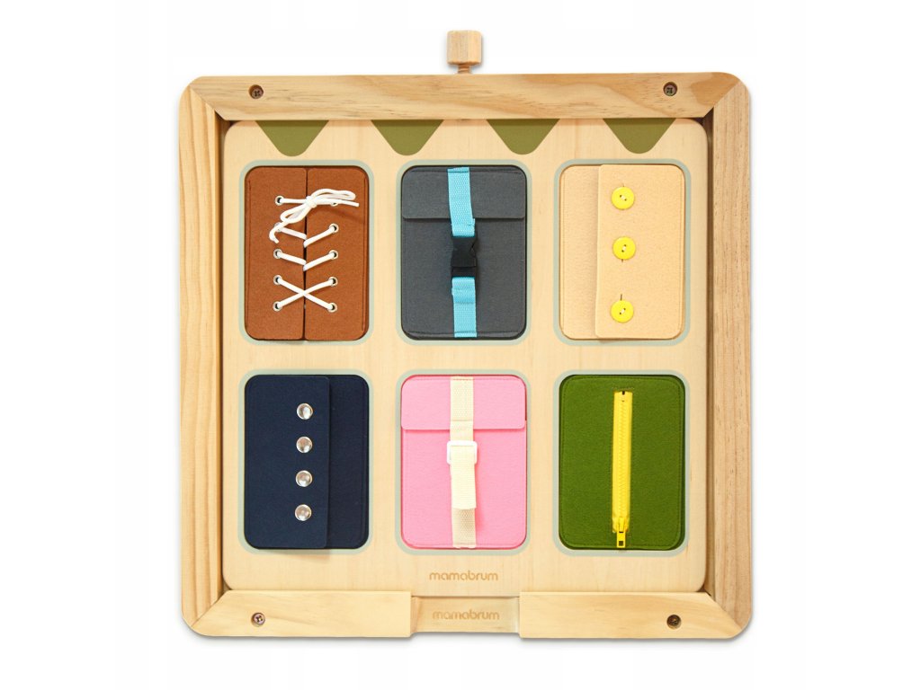 Dřevěná manipulační tabule Montessori – senzorické učení samostatnosti je ideální pomůckou pro rozvoj praktických dovedností, trpělivosti a sebevědomí dítěte.