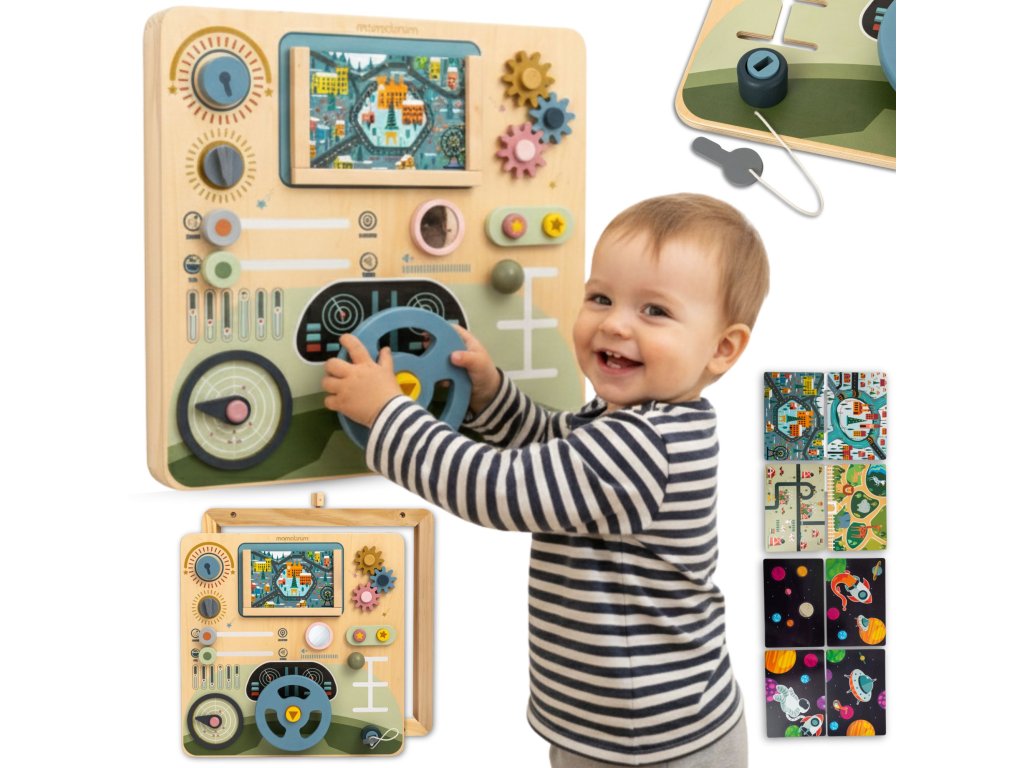 Dřevěná tabule Montessori „Malý řidič a pilot“ promění každou hru v napínavou cestu plnou představivosti a objevů. Volant jako v opravdovém autě nebo raketě, řadicí páka, přístroje, ovladače a mapy – vše, co dítě potřebuje, aby se cítilo jako skutečný řidič, pilot nebo dobrodruh.