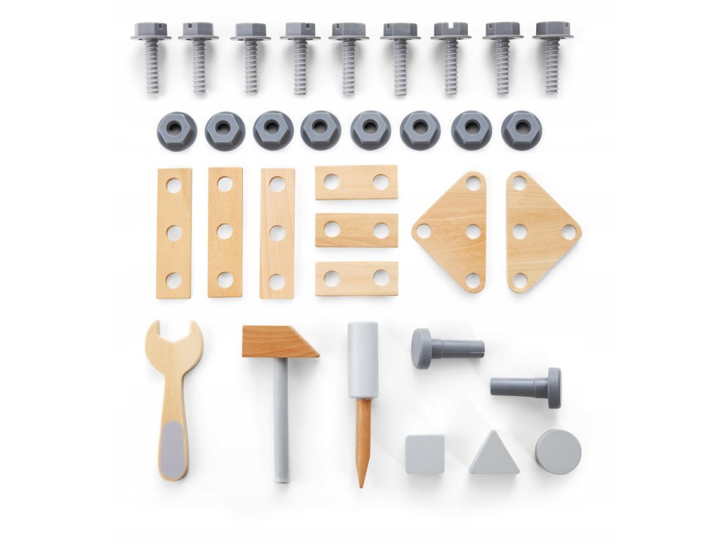 - Doplňky: šrouby, matice, dřevěné destičky s otvory, kostky,