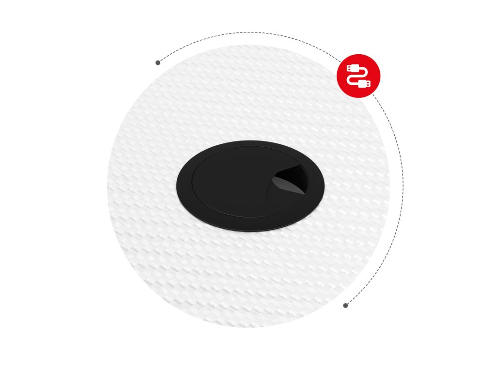 Na obou stranách pracovní desky jsou umístěny průchodky pro vedení kabelů, které pomáhají udržet pořádek a čistý vzhled stolu.