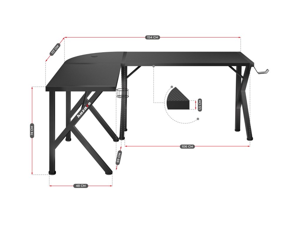 Herní stůl VELOX 6.3 je navržen tak, aby nabídl maximální komfort, chytré využití prostoru a moderní herní design. Díky tvaru písmene L se perfektně hodí do rohu místnosti a poskytuje dostatek místa pro všechny herní i pracovní potřeby.