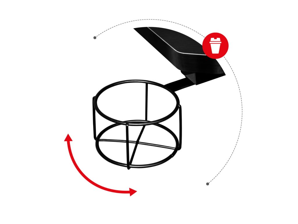 -Držák na nápoj (cup holder) – bezpečné místo pro pití, bez rizika polití vybavení.