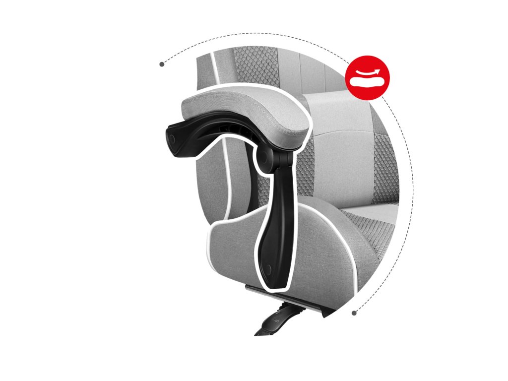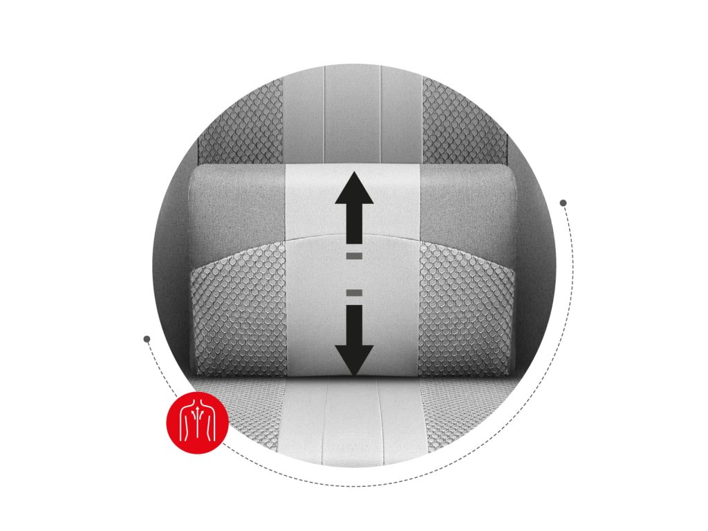 Profilované polštáře pod krk a bederní opěrka podporují správné držení páteře a zajišťují pohodlí i při dlouhém sezení. Oba jsou odnímatelné a výškově nastavitelné, aby se přizpůsobily individuálním potřebám uživatele.