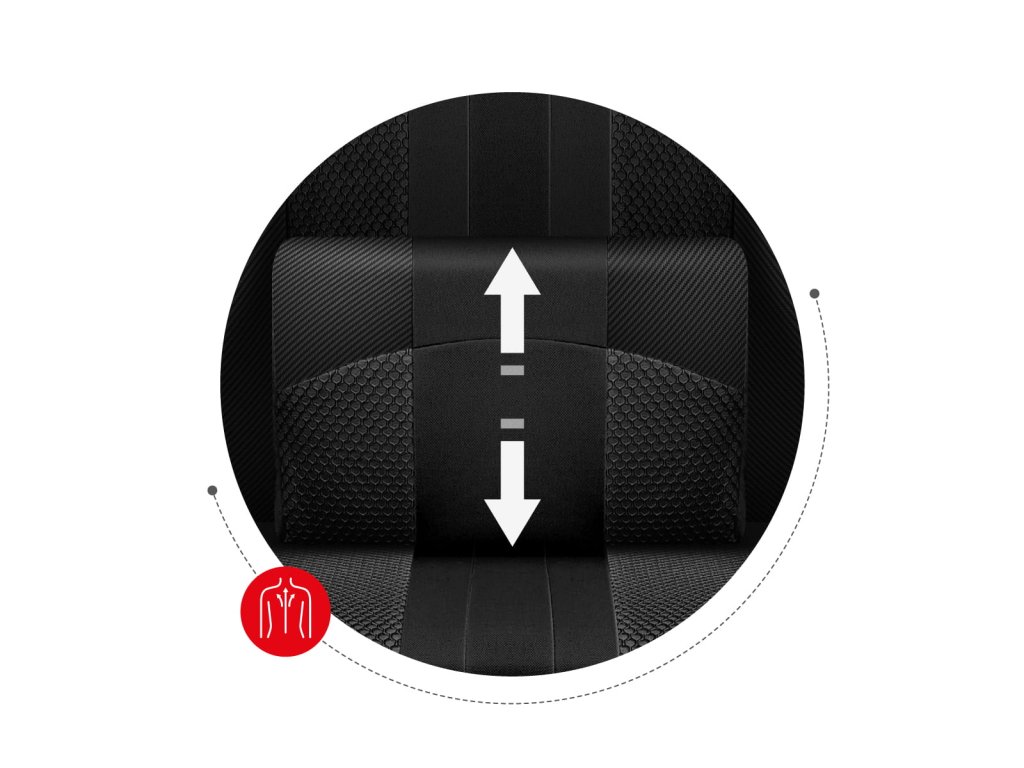 Profilované polštáře pod krk a bederní opěrka podporují správné držení páteře a zajišťují pohodlí i při dlouhém sezení. Oba jsou odnímatelné a výškově nastavitelné, aby se přizpůsobily individuálním potřebám uživatele.