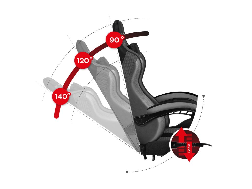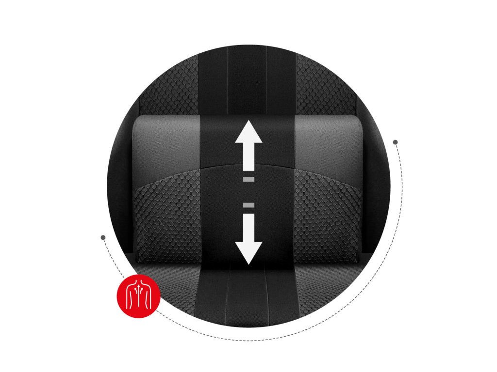 Profilované polštáře pod krk a bederní opěrka podporují správné držení páteře a zajišťují pohodlí i při dlouhém sezení. Oba jsou odnímatelné a výškově nastavitelné, aby se přizpůsobily individuálním potřebám uživatele.