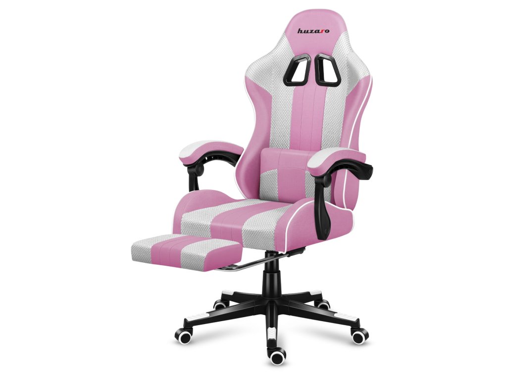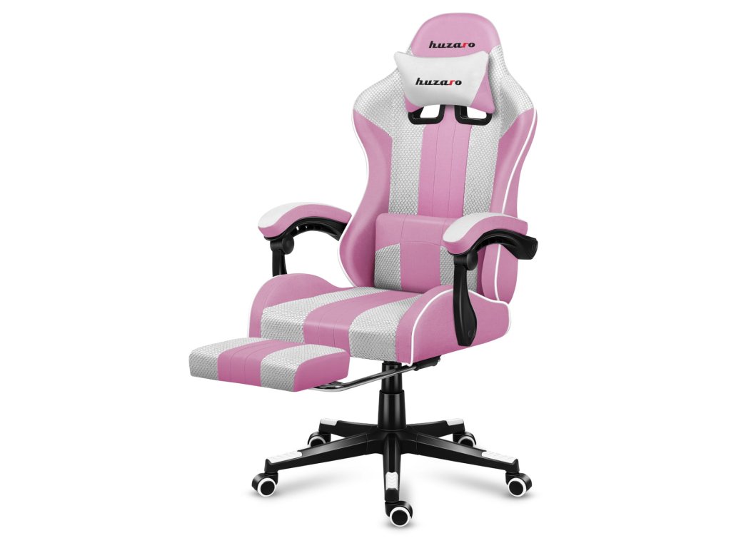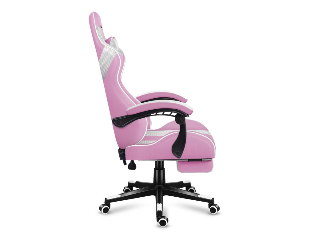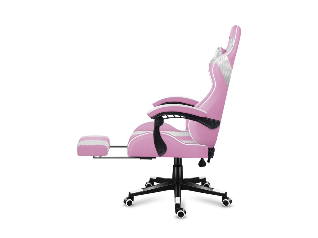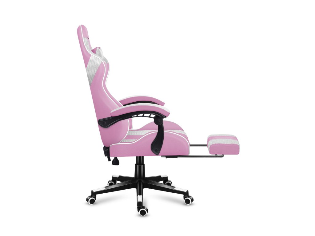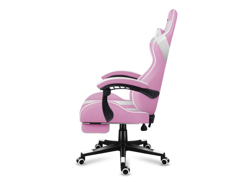 - Stylová růžová herní židle s výsuvnou opěrkou nohou – ideální pro odpočinek po dlouhém dni.