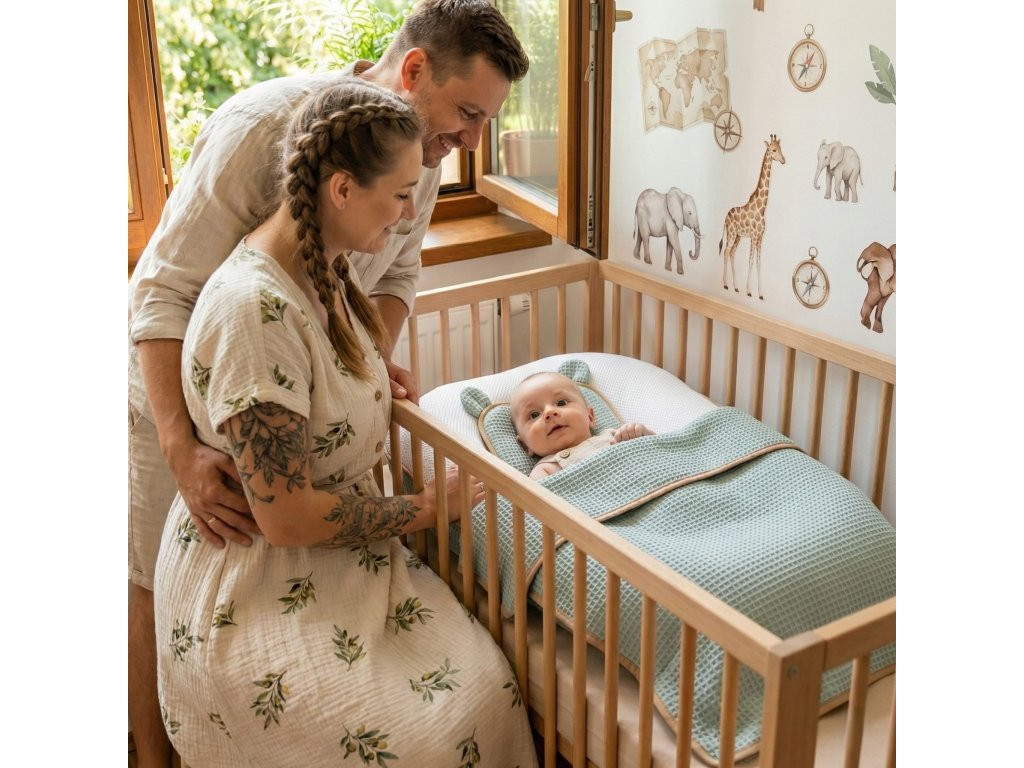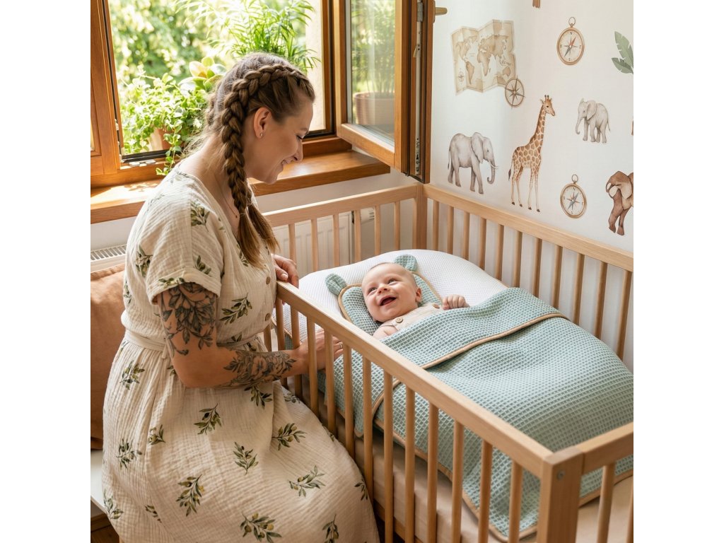- Měkká bavlněná deka „vafle“ – ideální k zabalení i jemné senzorické stimulaci