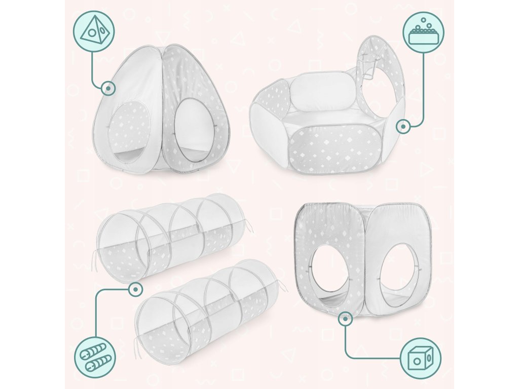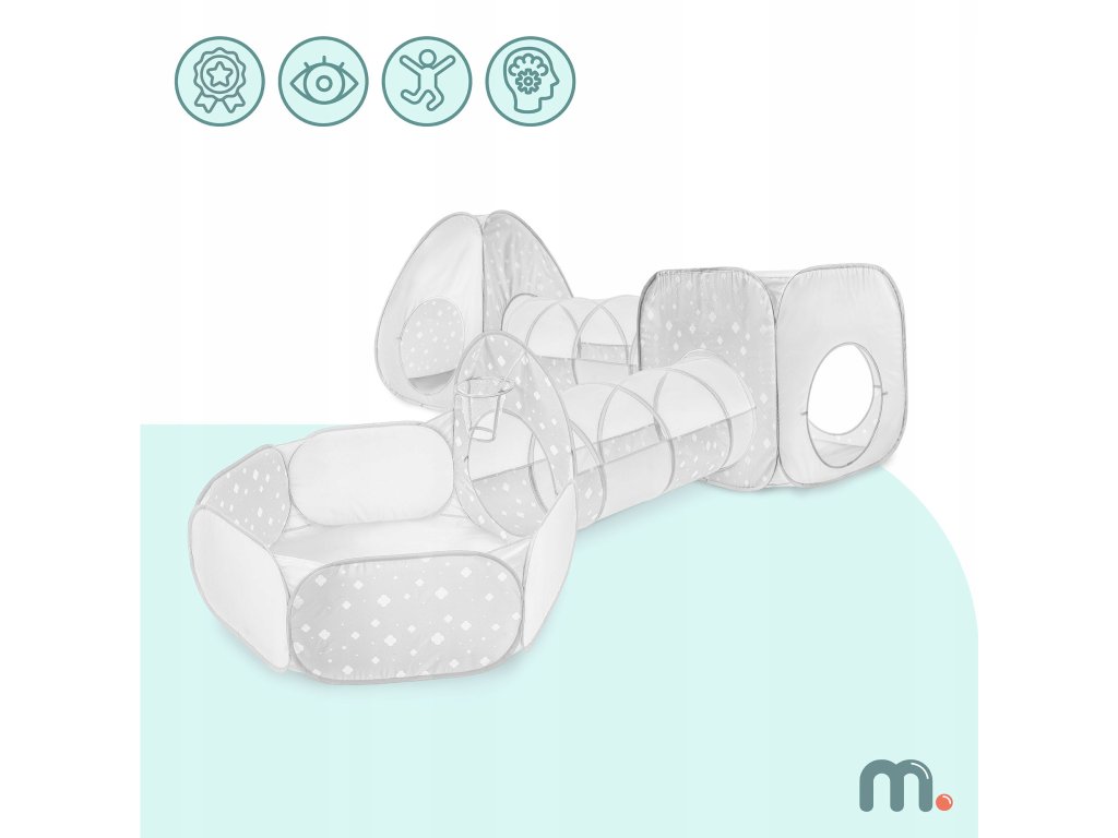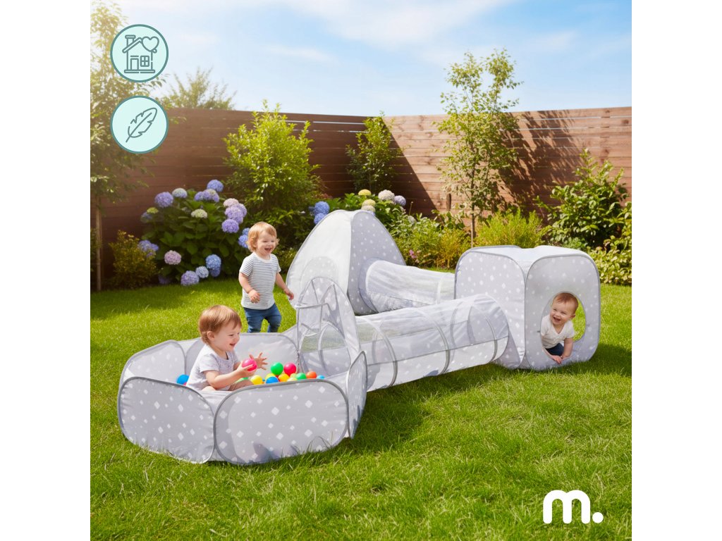 Sada obsahuje dva stany, dva tunely a bazének na míčky, které lze libovolně kombinovat nebo používat samostatně. Každý den může herní sestava vypadat jinak – jednou jako tajná základna, jindy jako překážková dráha nebo barevné dětské hřiště. Fantazii se zde meze nekladou.