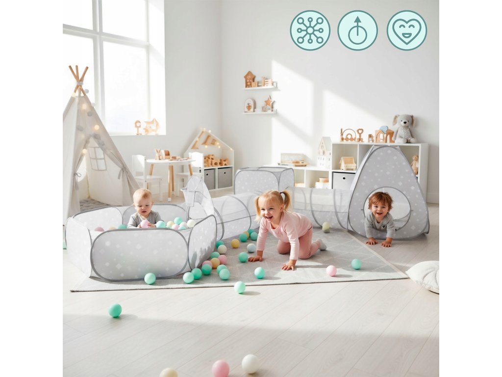 Hra ve stanech, tunelech a bazénku s míčky podporuje motoriku, koordinaci pohybů i rovnováhu. Lezení, plazení a prolézání přirozeně motivuje děti k aktivnímu pohybu.