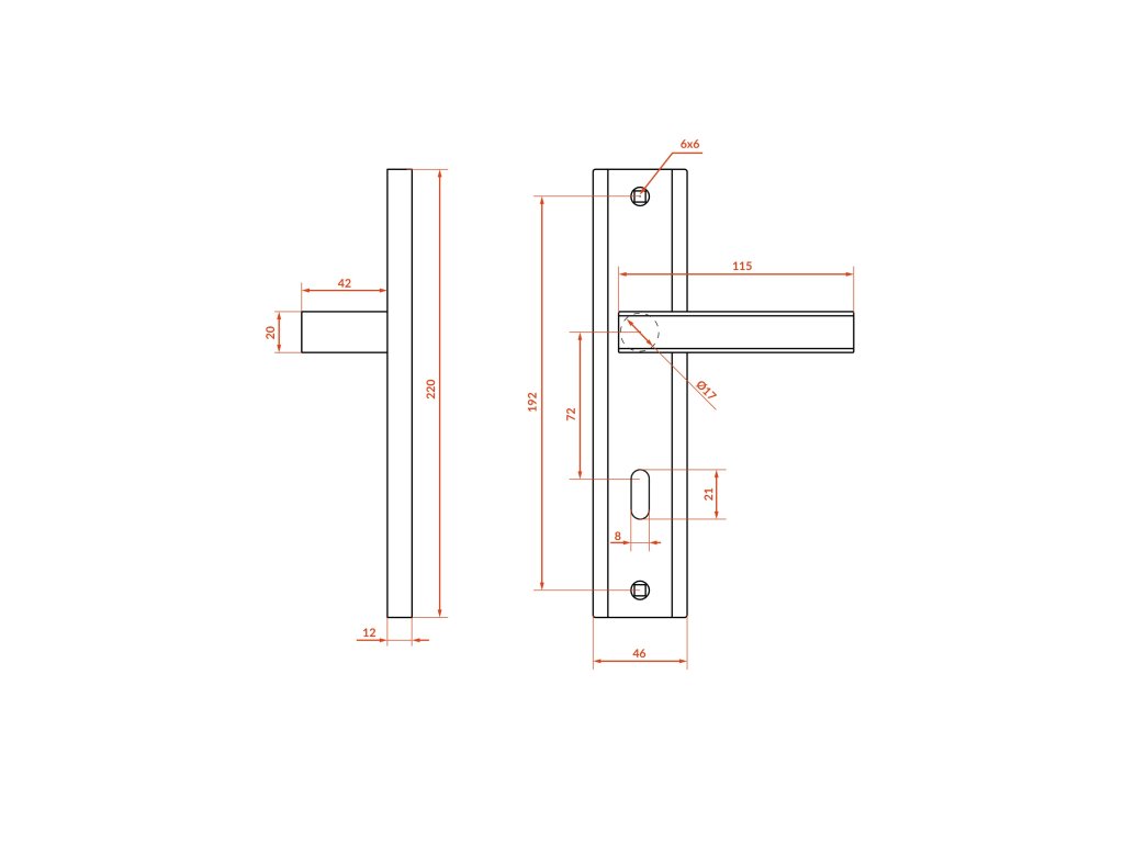 Model ARIA je vybaven dlouhým štítem s otvorem pro klíč, který umožňuje použití běžných interiérových zámků. Rozteč 72 mm odpovídá standardním rozměrům pro interiérové dveře a zajišťuje kompatibilitu s většinou dostupných zámkových mechanismů.