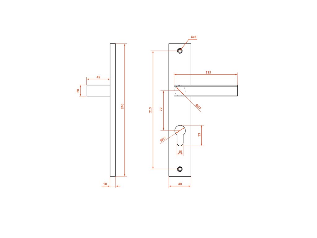 Model ASTER je vybaven dlouhým štítem s otvorem pro cylindrickou vložku, který umožňuje použití běžných interiérových zámků. Rozteč 72 mm odpovídá standardním rozměrům pro interiérové dveře a zajišťuje kompatibilitu s většinou dostupných zámkových mechanismů.