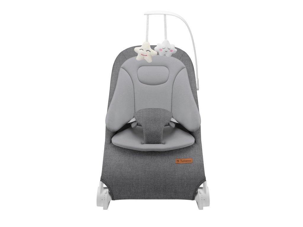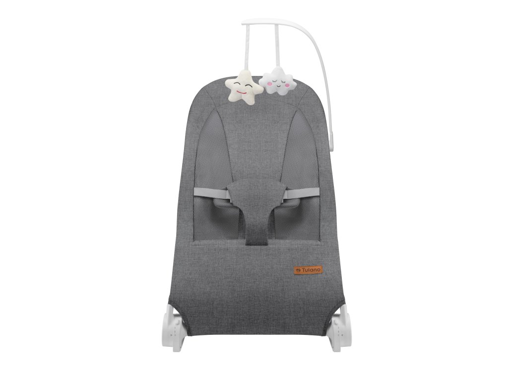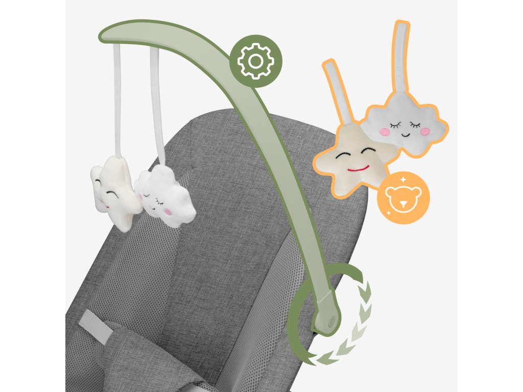 Odnímatelná hrazdička se dvěma roztomilými hračkami (mráček a hvězdička) zaručuje úsměv i rozvoj jemné motoriky: