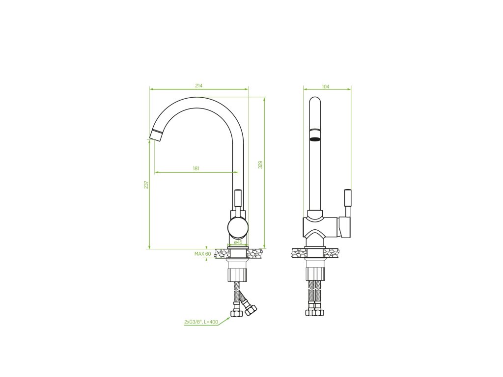 Baterie LETE je vybavena otočnou výlevkou ve tvaru písmene U, která nabízí dostatek prostoru a pohodlí při každodenním používání. Dosah výlevky 182 mm a celková výška baterie 318 mm umožňují komfortní mytí nádobí, oplachování potravin i napouštění vyšších nádob a hrnců. Pohyblivá konstrukce zvyšuje flexibilitu a usnadňuje práci u dřezu.
