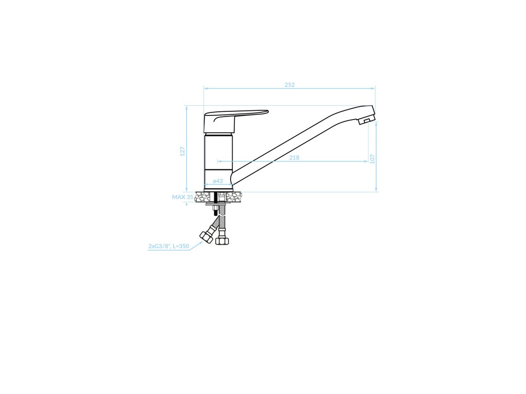 Kuchyňská baterie SAGRA je určena pro stojánkovou montáž a je dodávána s připojovacími hadičkami o délce 350 mm, které umožňují pohodlné napojení na vodovodní rozvod. Standardní perlátor zajišťuje rovnoměrný a příjemný proud vody při každodenním používání.