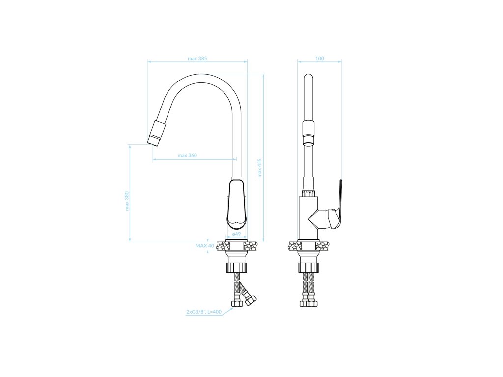 Baterie ELZA je vybavena flexibilní výlevkou ve tvaru písmene U, která nabízí dva režimy proudu vody. Díky tomu lze proud snadno přizpůsobit aktuální potřebě – od běžného napouštění vody až po oplachování potravin nebo mytí většího nádobí. Maximální dosah výlevky až 360 mm zajišťuje vysokou flexibilitu a pohodlí při každodenním používání.