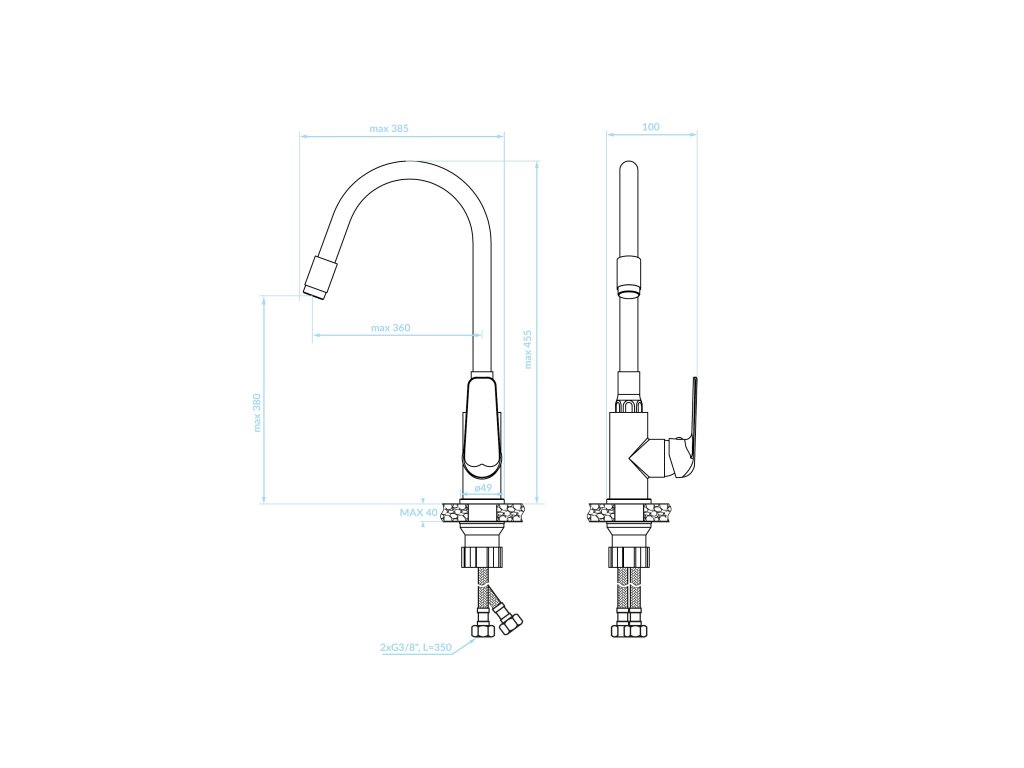 Baterie je určena pro stojánkovou montáž a je vybavena systémem snadné instalace, který umožňuje rychlou a bezproblémovou montáž bez nutnosti speciálního nářadí. Připojovací hadičky o délce 350 mm usnadňují napojení na vodovodní rozvod. Akustická třída I (≤ 20 dB) zaručuje velmi tichý chod, ideální i do otevřených kuchyňských prostor.