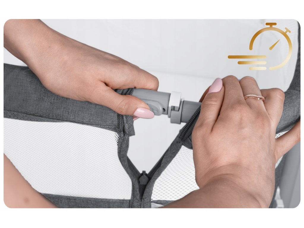 Přístavná postýlka Sleep&Go je ideálním řešením pro rodiče, kteří chtějí mít své miminko vždy nablízku. Díky pevné konstrukci, nastavitelné výšce a praktickým upevňovacím popruhům poskytuje dítěti bezpečný prostor pro spánek a rodičům – klidnější noci a rychlý přístup k dítěti, např. při nočním kojení.