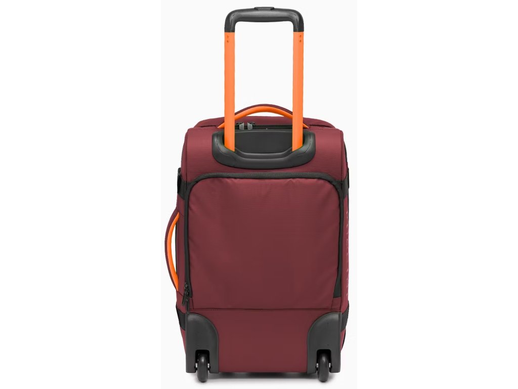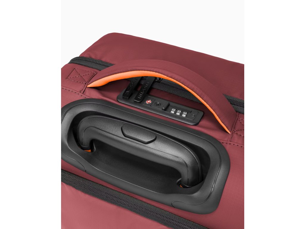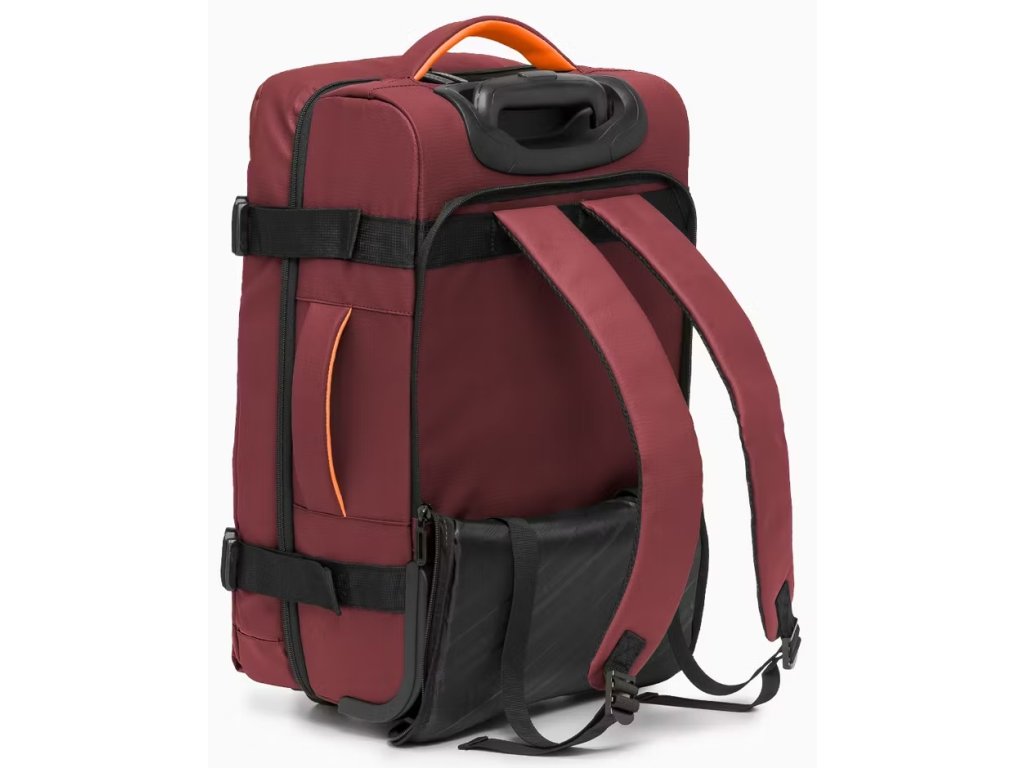 Malý kufr je vybaven speciálními popruhy, které vám umožní nosit jej jako batoh. Měkká, široká a nastavitelná ramínka jsou ukryta ve speciální kapse. Po jejich vyjmutí a nasazení kabinového kufru na záda lze klopou ze zmíněné kapsy zakrýt kola, aby vám neušpinila záda.